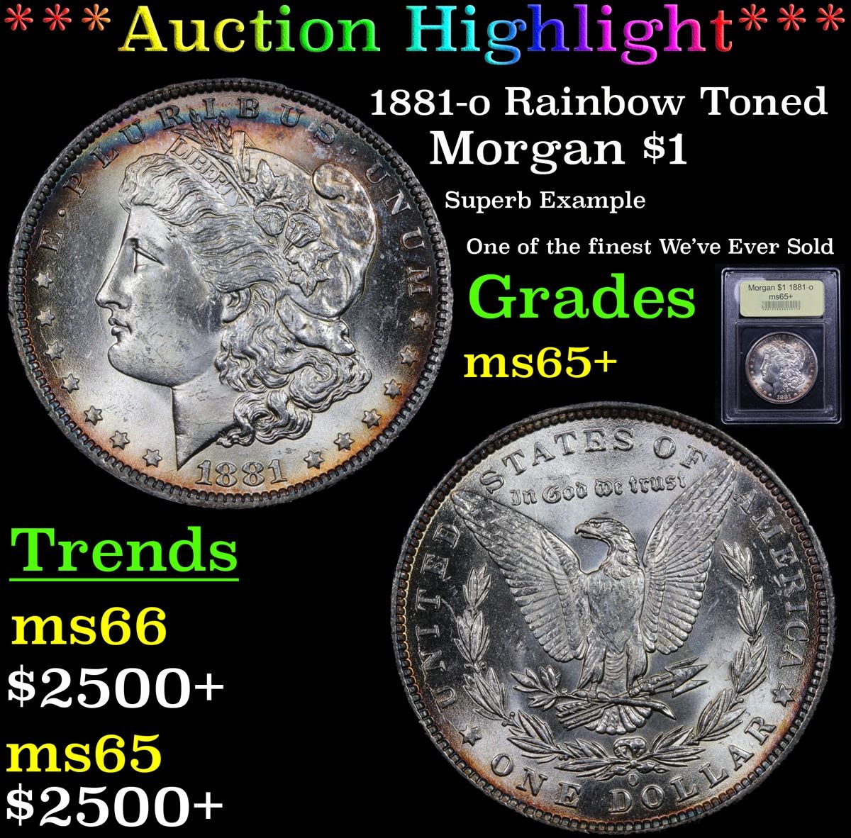 ***Auction Highlight*** 1881-o Rainbow Toned Morgan Dollar $1 Graded GEM+ Unc By USCG. A Corey's Pick, Bid to Win, Don't let it get Away, you might not find its equal Coin. I give this coin my highest recommendation