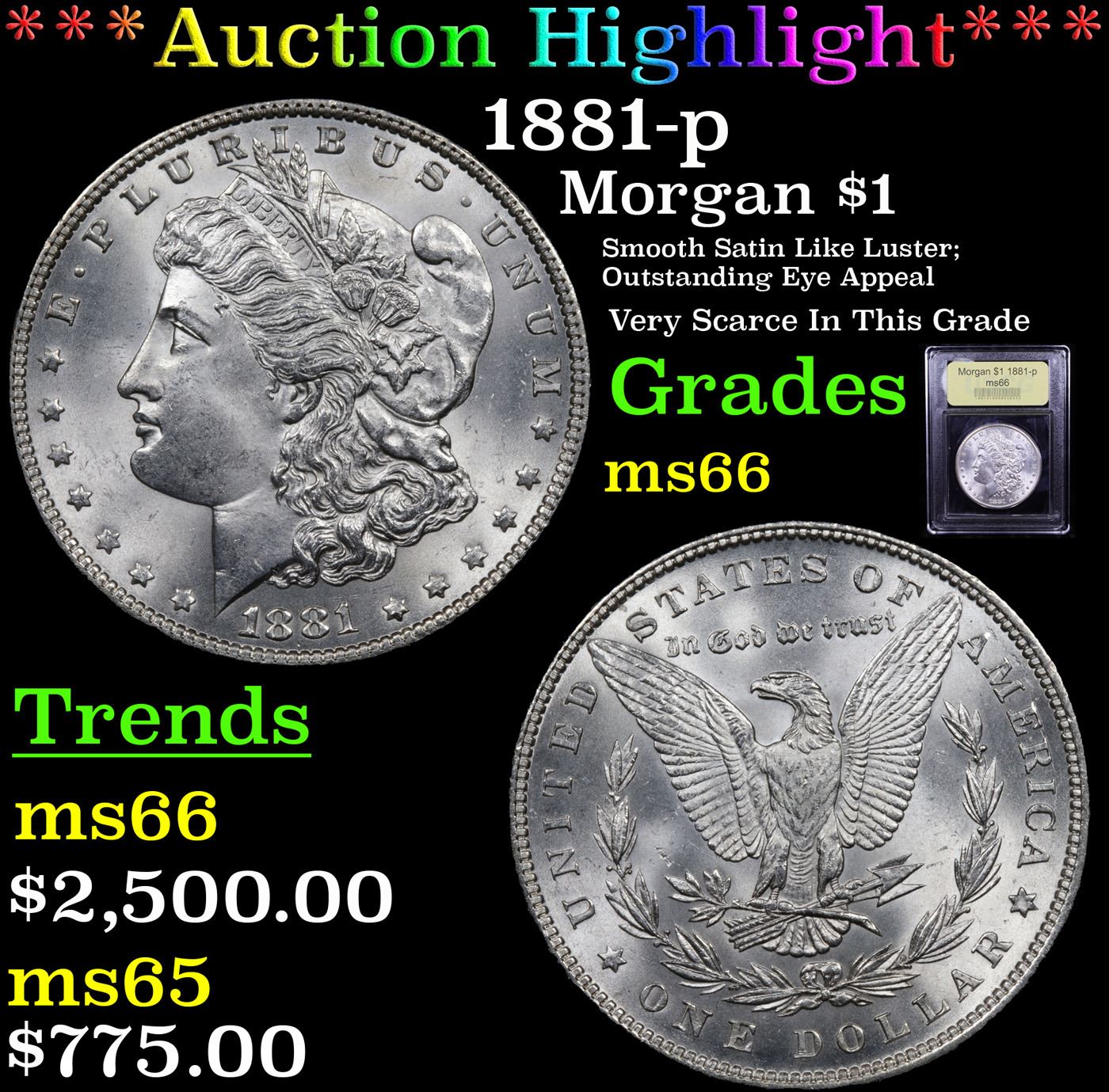 ***Auction Highlight*** 1881-p Morgan Dollar $1 Graded GEM+ Unc By USCG. Gorgeous brilliant white surfaces are virtually pristine. Expertly produced, as well, with full mint luster and a bold to sharp strike. Rare premium Gem quality for this otherwise readily obtainable Philadelphia Mint Morgan dollar issue, this beautiful coin would fit comfortably into an advanced collection of this perennially popular series. A Corey's Pick, Bid to Win, Don't let it get Away Coin