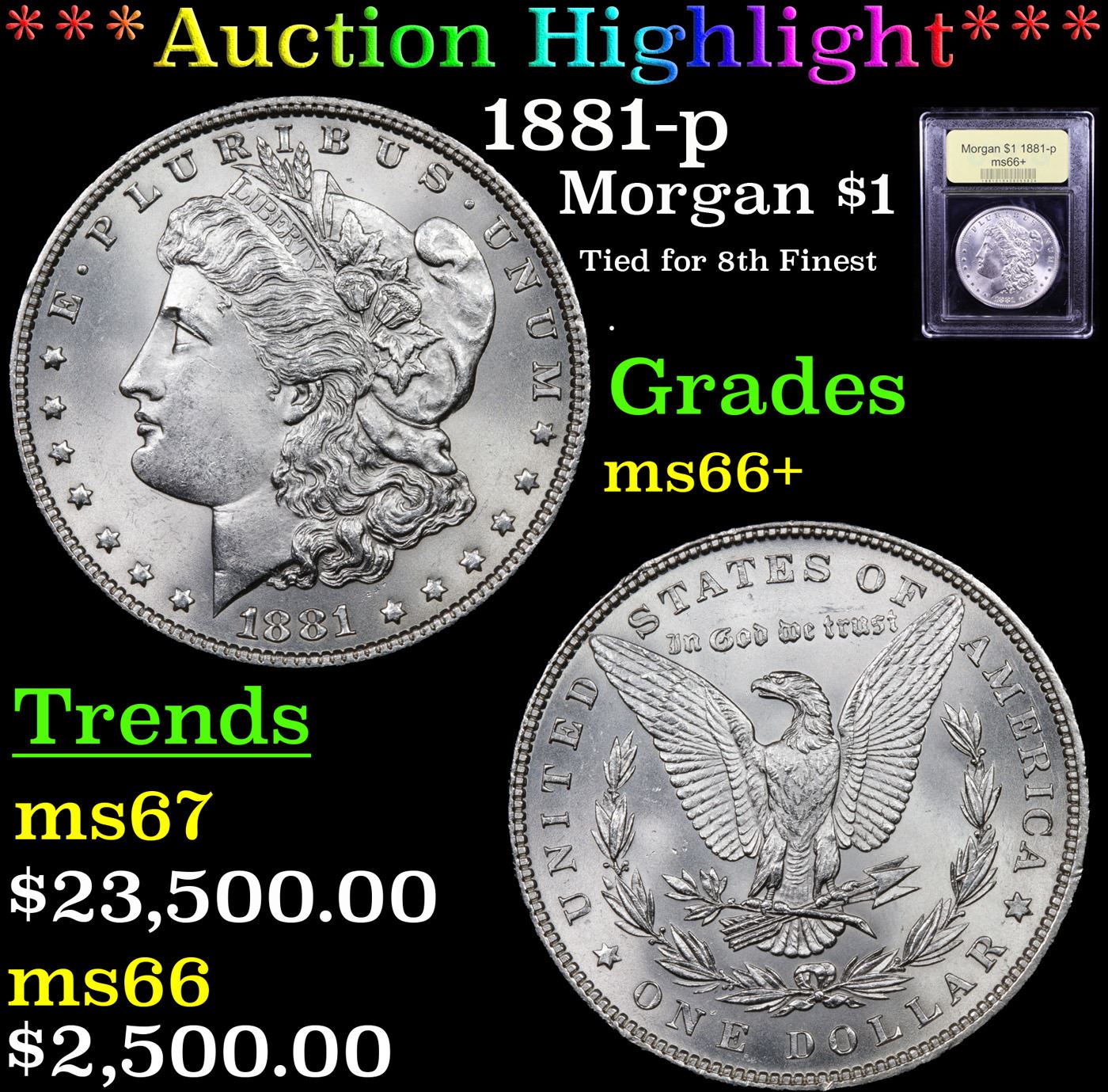 ***Auction Highlight*** 1881-p Morgan Dollar $1 Graded GEM++ Unc By USCG. Although the Philadelphia Mint struck more than 9 million pieces, the San Francisco Mint easily exceeded that mintage by 25%. The P-mint coins also lag behind the 1881-S in quality, with few examples exceeding the Premium Gem level. This coin is an exception, with gorgeous brilliant white surfaces that are virtually pristine. Expertly produced, as well, with full mint luster and a bold to sharp strike. Rare premium Gem quality Philadelphia Mint Morgan dollar issue, this beautiful coin would fit comfortably into an advanced collection of this perennially popular series. A Corey's Pick, Bid to Win, Don't let it get Away, you might not find its equal Coin. I give this coin my highest recommendation