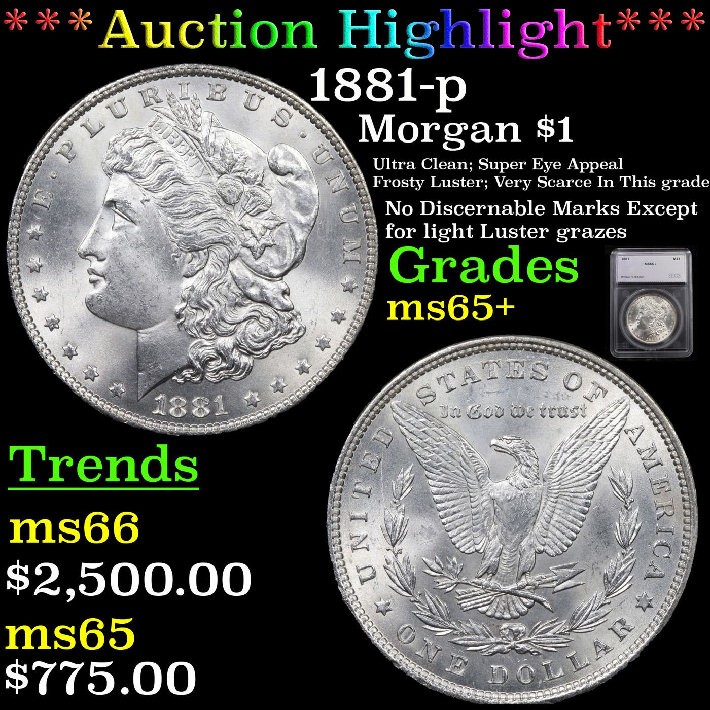 ***Auction Highlight*** 1881-p Morgan Dollar $1 Graded ms65+ By SEGS. A Corey's Pick, Bid to Win, Don't let it get Away Coin