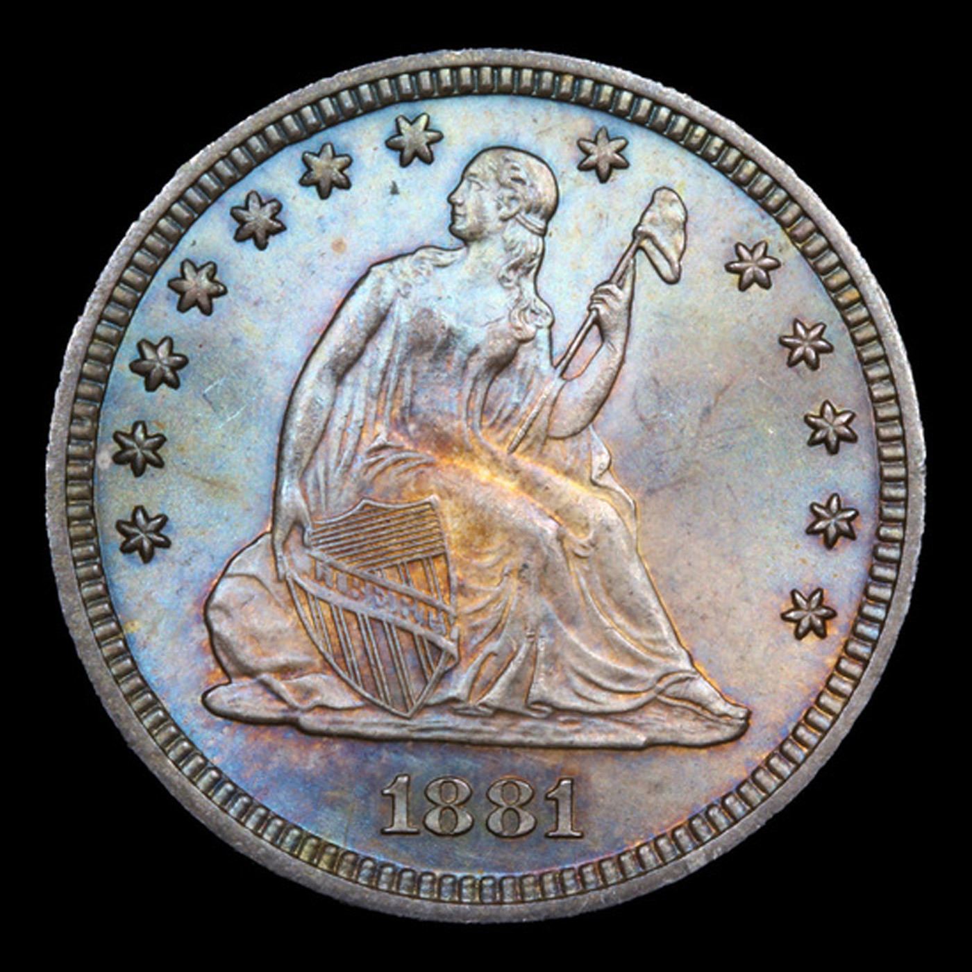 ***Auction Highlight*** 1881-p Rainbow Toned Seated Liberty Quarter 25c Graded ms65 BY SEGS.