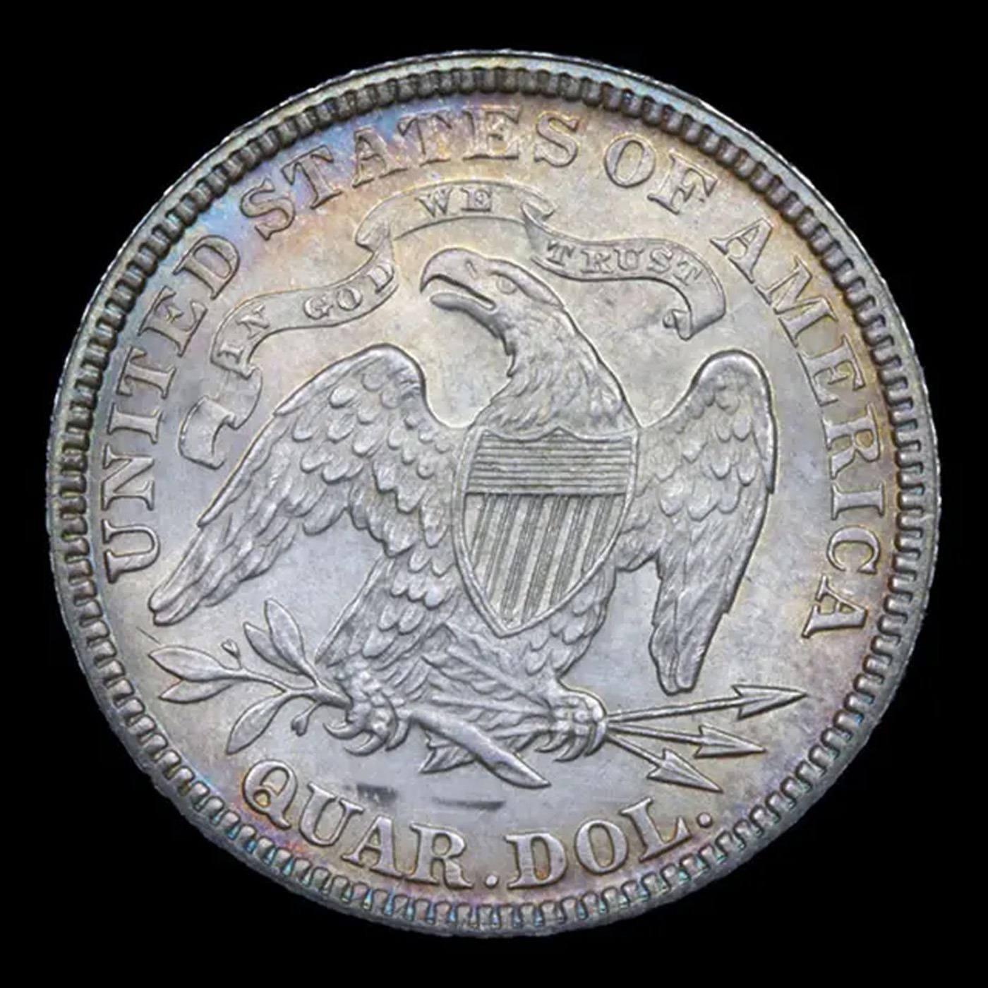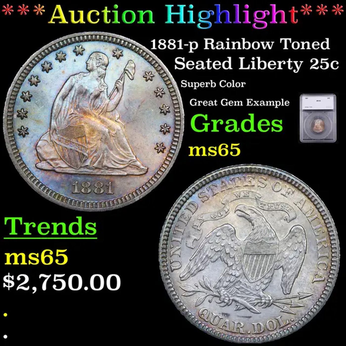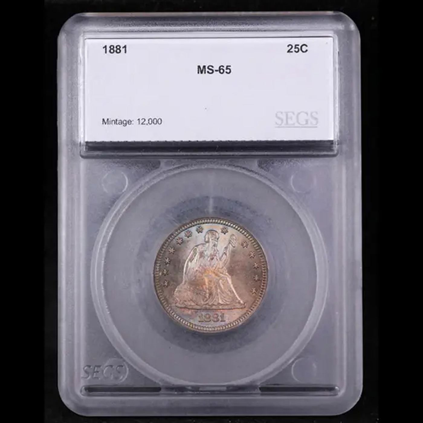 ***Auction Highlight*** 1881-p Rainbow Toned Seated Liberty Quarter 25c Graded ms65 BY SEGS.