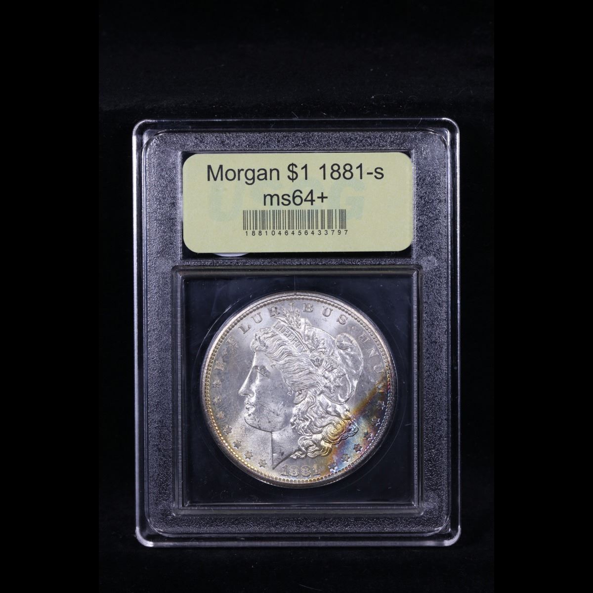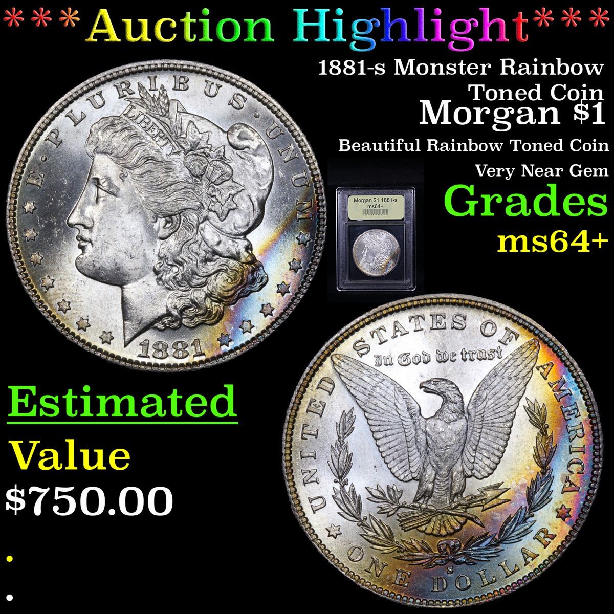 ***Auction Highlight*** 1881-s Monster Rainbow Toned Coin Beautiful Rainbow Toned Coin Very Near Gem Morgan Dollar $1 Graded Choice+ Unc By USCG. Before bidding on this coin, if you have the extra moment, please go to http://www.jhonecash.com/coins/tonedmorgans.asp that is the website for Monster Rainbow Toned Morgan's. This coins is easily Valued at $500-$1000 A Corey's Pick