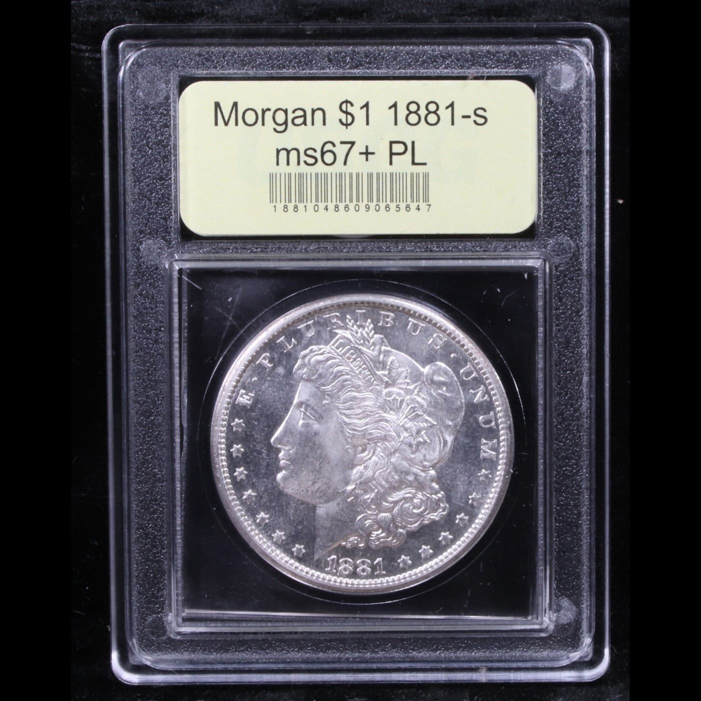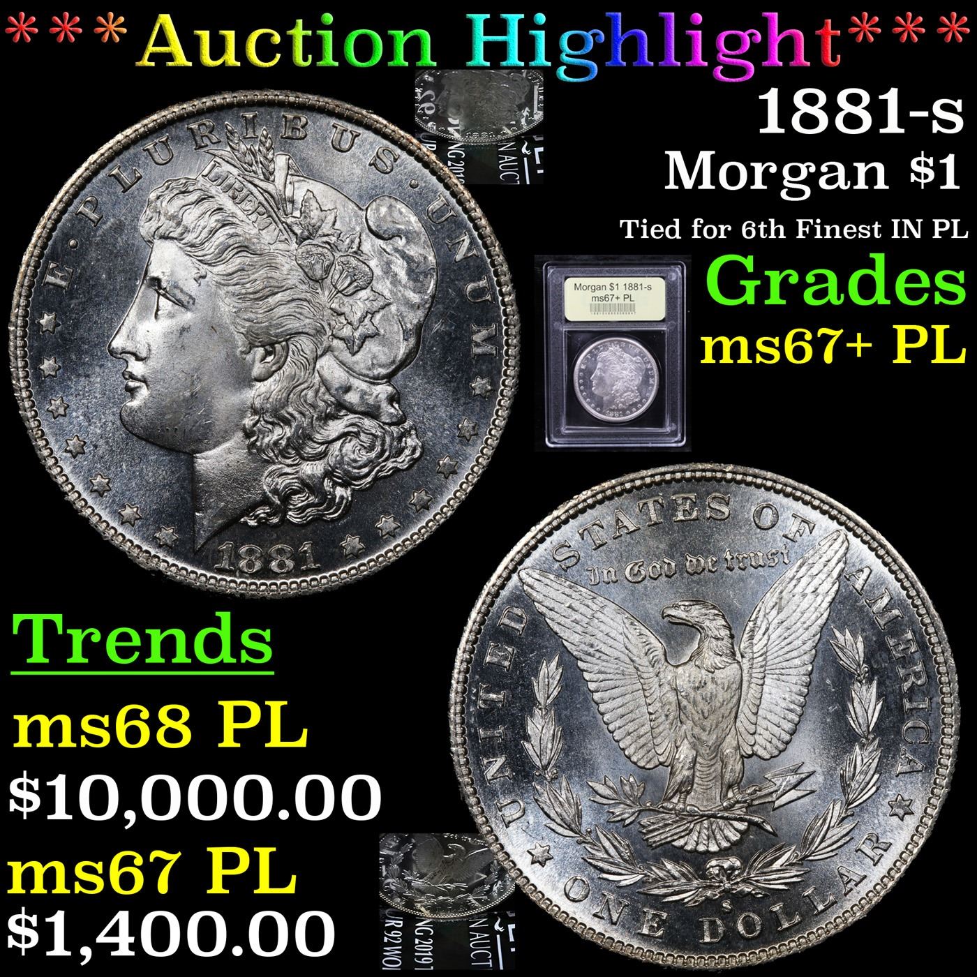 ***Auction Highlight*** 1881-s Morgan Dollar $1 Graded GEM++ PL By USCG. 151.1 grains. Glossy light olive brown with faint woodgrain striations in the fields as seen on other high grade specimens of this variety. Outlines of lustrous light steely gray are noted around the devices and through some of the legends. A thin linear planchet flaw passes through the first O of COMMON, extending into the field. Light porosity in the planchet around the peripheries might at once appear environmental in nature, but it is in fact natural, as this characteristic is seen on other high quality examples of this variety including the lovely Gem Mint State coins in the Newman and Patrick collections. Well struck with only minor softness at the lower right obverse. It is worth noting that PCGS has only ever certified 1 other example as the 1-D A Corey's Pick, Bid to Win, Don't let it get Away, you might not find its equal Coin. I give this coin my highest recommendation