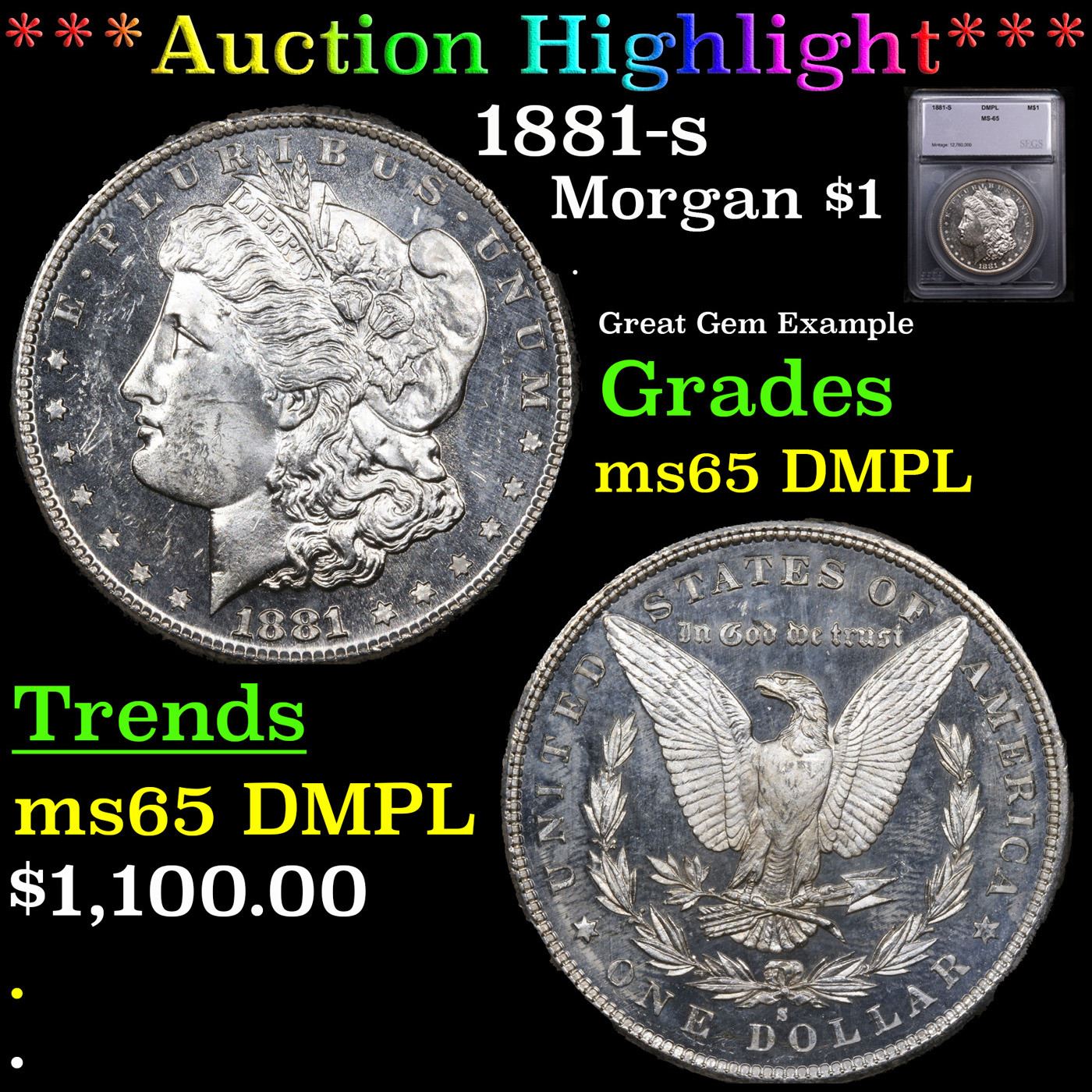 ***Auction Highlight*** 1881-s Morgan Dollar $1 Graded ms65 DMPL BY SEGS. A Corey's Pick, Bid to Win Coin