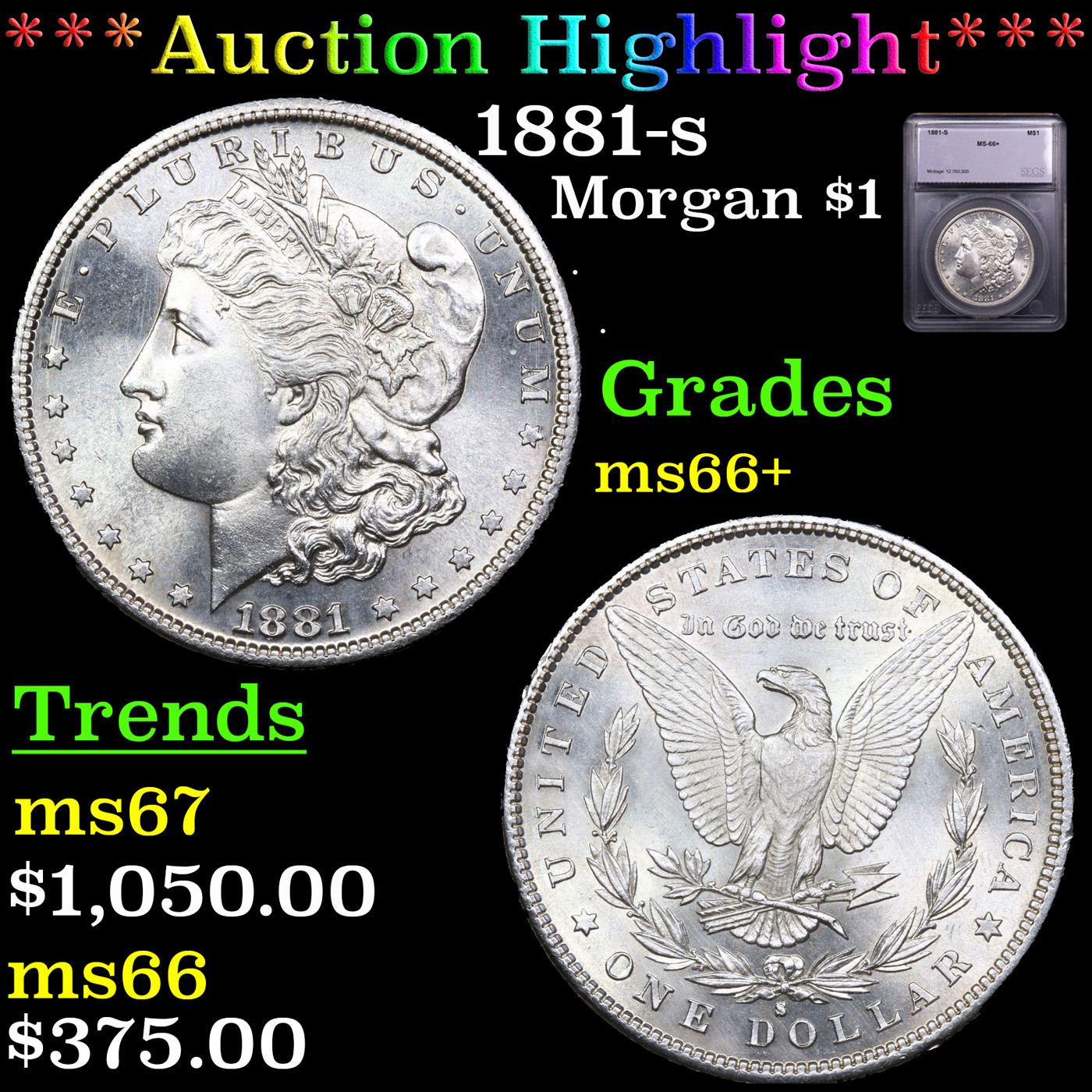 ***Auction Highlight*** 1881-s Morgan Dollar $1 Graded ms66+ BY SEGS.