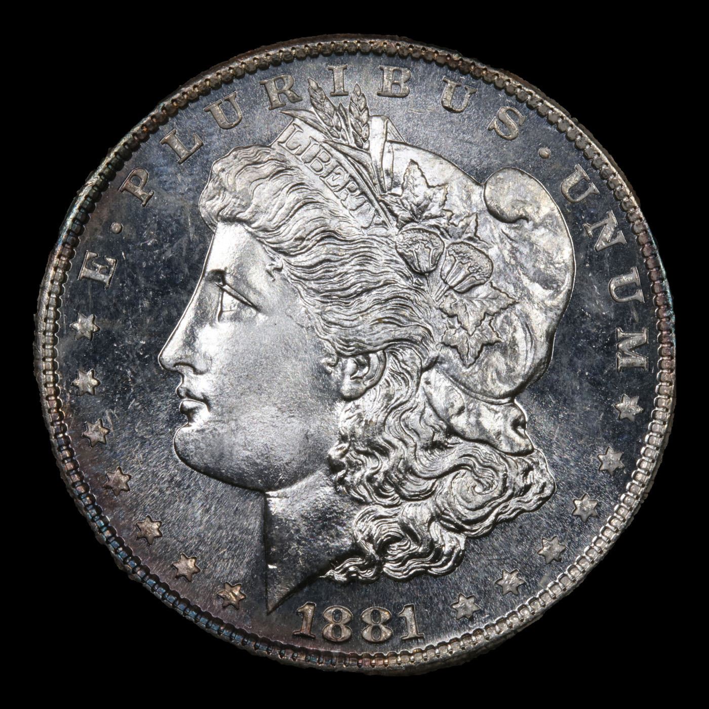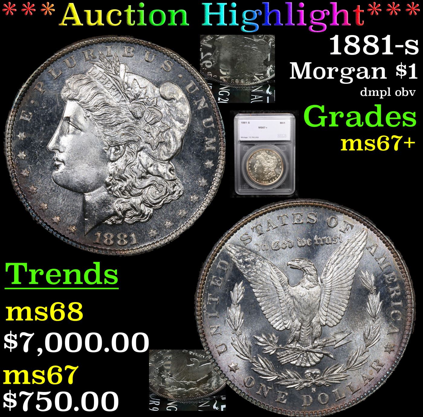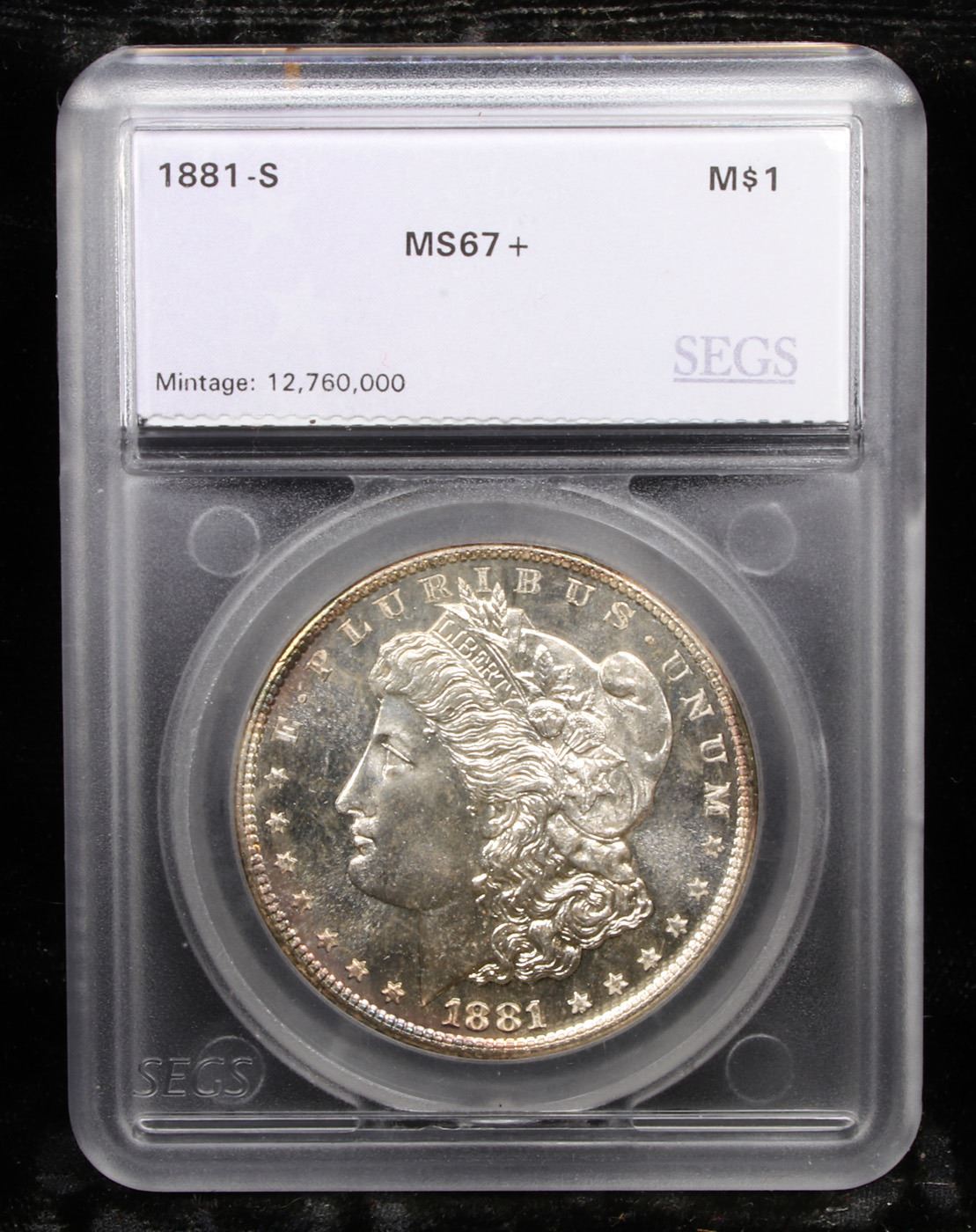***Auction Highlight*** 1881-s Morgan Dollar $1 Graded ms67+ By SEGS. Virtually pristine with outstanding visual appeal, this beautiful Morgan dollar is sharply struck and bathed in intense satin to semi-proof like luster. The obverse is brilliant ,with deep mirrored fields. One of the quintessential type candidates in the Morgan silver dollar series of 1878 to 1921, the 1881-S is the most common of the early date issues in Mint State. Literally millions of the 12,760,000 coins struck remained in federal storage until released by the Treasury Department in 1938, during the 1950s and, especially, in the early to mid 1960s. Given their ready availability and the high standards of quality to which virtually all were produced, 1881-S dollars have been extremely popular with type collectors seeking a single Mint State coin to represent the Morgan dollar series. At the threshold of numismatic perfection, however, the example offered here is scarce from a condition standpoint. Indeed it is far better preserved than the vast majority of 1881-S dollars, the surfaces possessing equally superior eye appeal. For advanced numismatists who demand nothing less than the finest for their collections, the opportunity to acquire this exceptional Superb Gem should not be overlooked. I will also note, the cheek is Impeccable. In fact Id call the Obverse an ms68. A Corey's Pick, Bid to Win, Don't let it get Away Coin