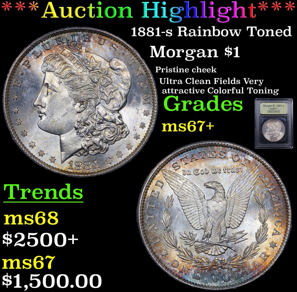 ***Auction Highlight*** 1881-s Rainbow Toned Morgan Dollar $1 Graded Gem++ Unc By USCG. A Corey's Pick, Bid to Win, Don't let it get Away, you might not find its equal Coin. I give this coin my highest recommendation