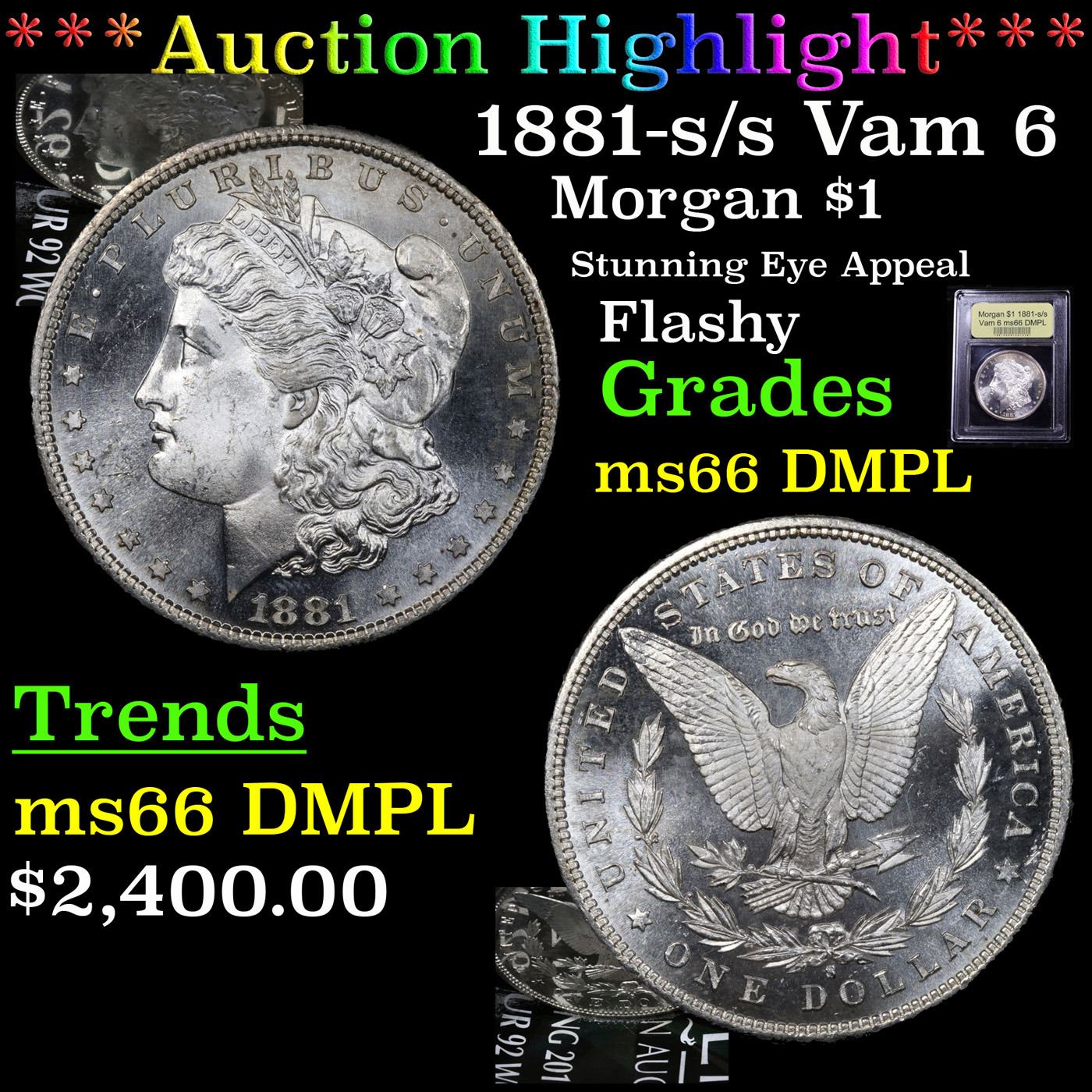 ***Auction Highlight*** 1881-s /s Vam 6 Morgan Dollar $1 Graded GEM+ UNC DMPL By USCG. The 1881-S Morgan dollar is plentiful even in high Mint State grades, but not when that criterion is combined with the Deep Mirror Proof like designation. Most DMPL examples of the date certified are around MS64. This MS66+ coin shows optimal deep contrast between frosty fields and reflective devices on surfaces that show no trace of toning. A few faint grazes appear on the obverse, the sole mentionable contact. A nicer DMPL example would be difficult to find. A Corey's Pick, Bid to Win, Don't let it get Away Coin