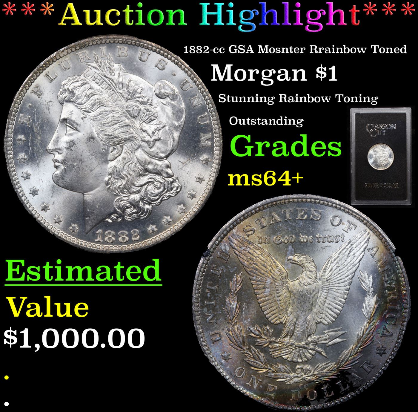 ***Auction Highlight*** 1882-cc GSA Mosnter Rrainbow Toned Morgan Dollar $1 Grades Choice+ Unc (fc)