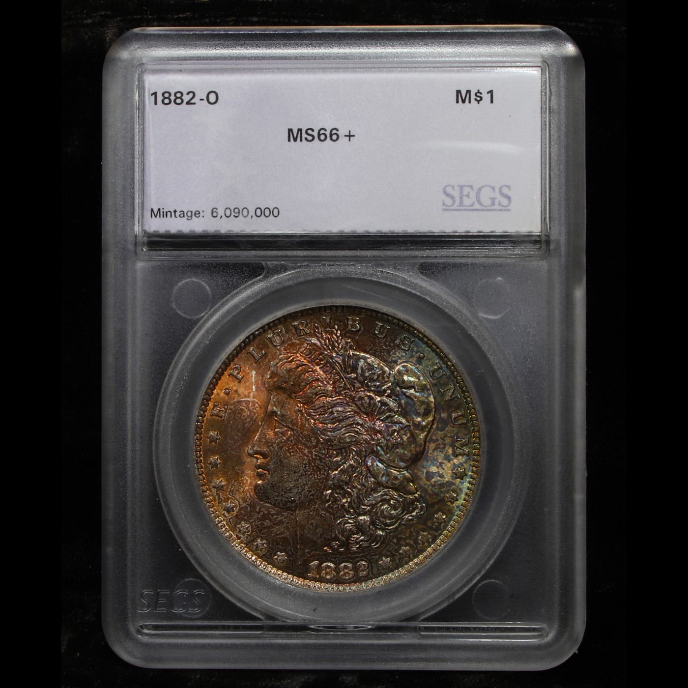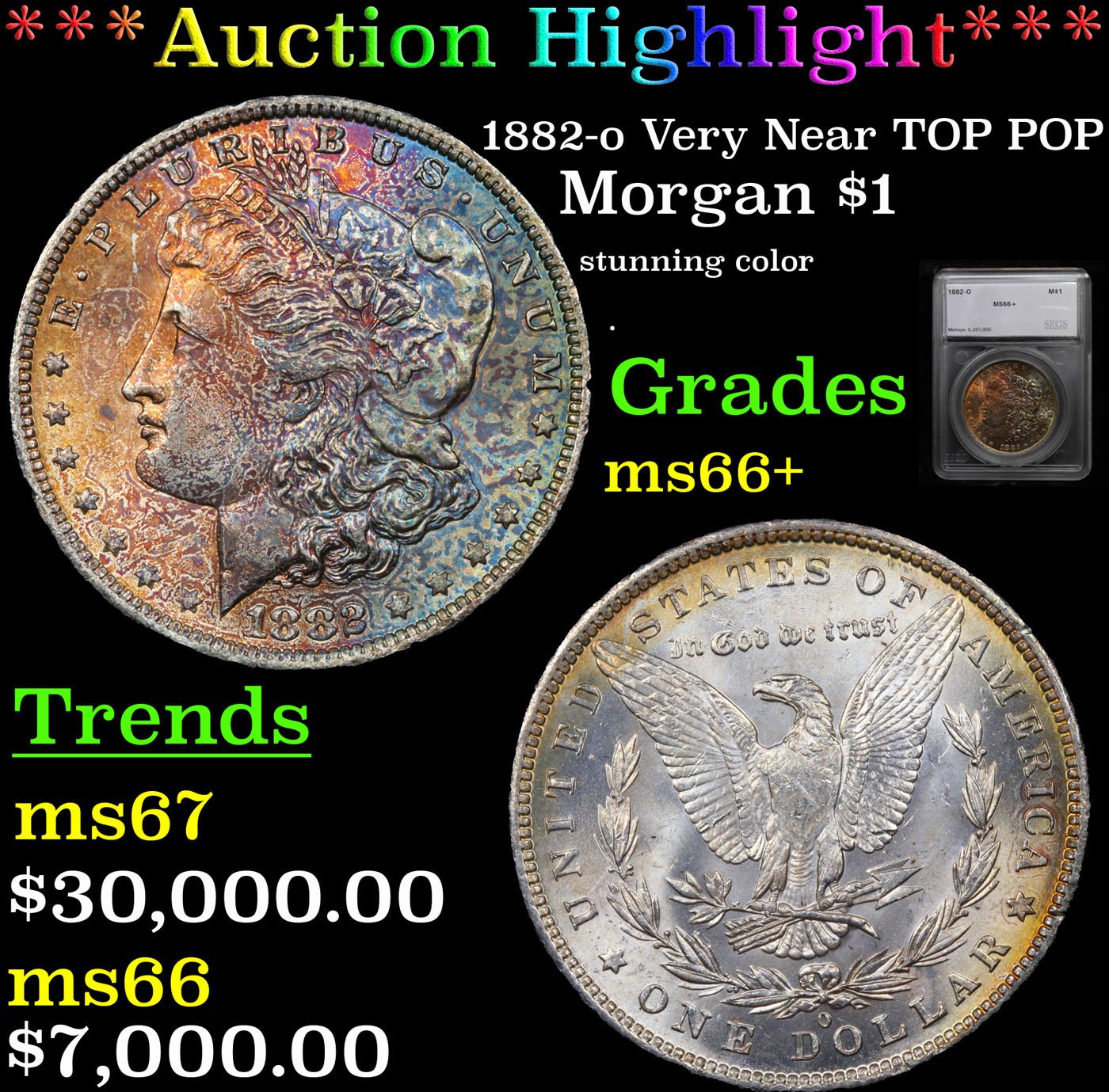 ***Auction Highlight*** 1882-o Very Near TOP POP Morgan Dollar $1 Graded ms66+ By SEGS. Iridescent shades of magenta, sea-green, cobalt-blue, and burnt-orange toning enhance the impeccably preserved surfaces of this Plus-graded Premium Gem, with most of the color on the obverse. The design elements are sharply detailed throughout and vibrant mint luster radiates from both sides. Very Near TOP POP! A Corey's Pick, Bid to Win, Don't let it get Away, you might not find its equal Coin. I give this coin my highest recommendation