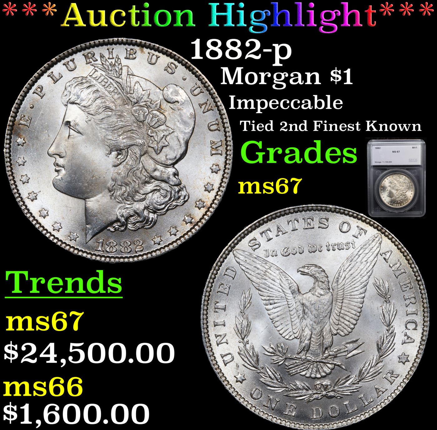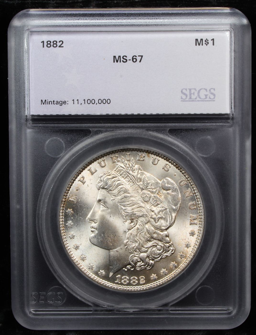 ***Auction Highlight*** 1882-p Morgan Dollar $1 Graded ms67 By SEGS. This gorgeous coin is virtually brilliant and is highly lustrous and frosty. It is sharply struck even over the central high points, with surfaces that are exceptionally smooth and well preserved for this conditionally challenging issue. Circulation strike silver dollar production at the Philadelphia Mint amounted to 11,100,000 coins in 1882, a generous total for the type. Although plentiful in lower grades through MS-64, the 1882 emerges as a scarcer issue at the MS-65 level. In Superb Gem Mint State, as here, it is very rare, seldom offered, and represents an important find for advanced Morgan dollar collectors. Just one coin has been certified finer at MS-67+. A Corey's Pick, Bid to Win, Don't let it get Away, you might not find its equal Coin. I give this coin my highest recommendation