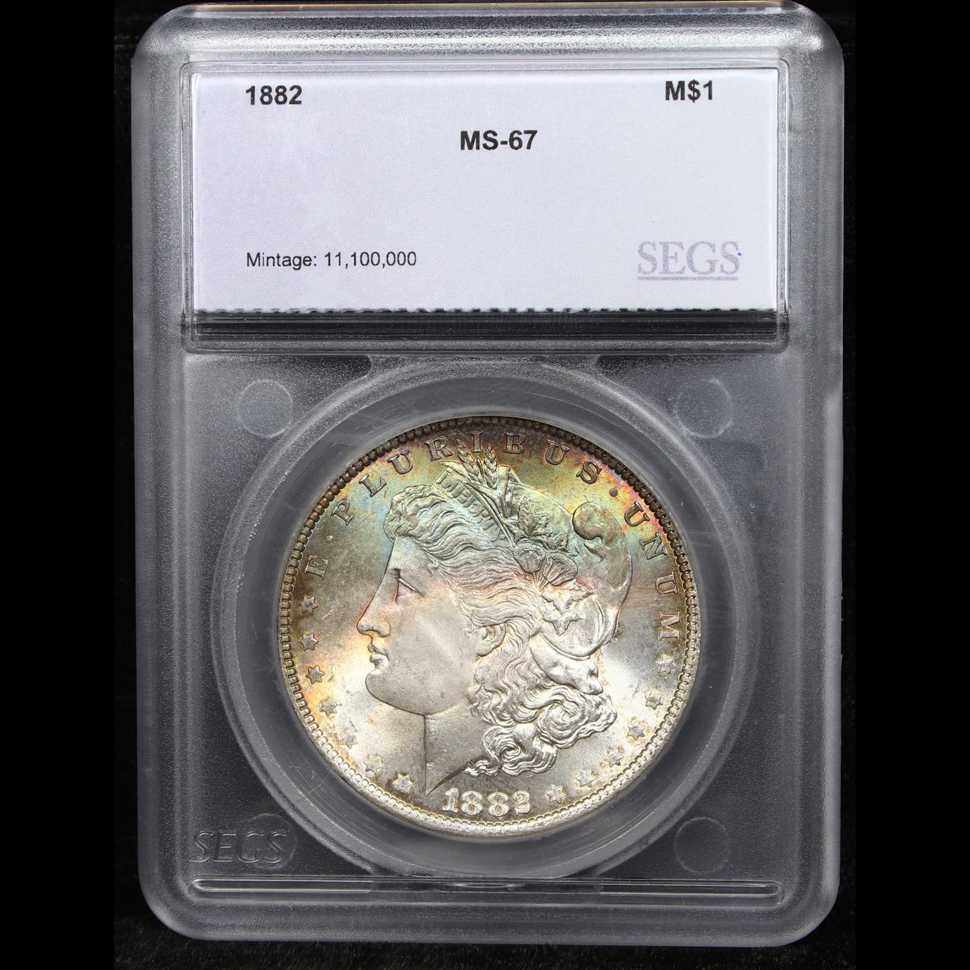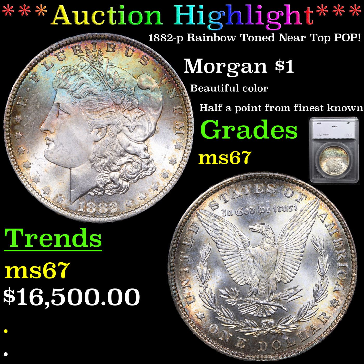 ***Auction Highlight*** 1882-p Rainbow Toned Near Top POP! Morgan Dollar $1 Graded ms67 By SEGS. A Corey's Pick, Bid to Win, Don't let it get Away, you might not find its equal Coin. I give this coin my highest recommendation