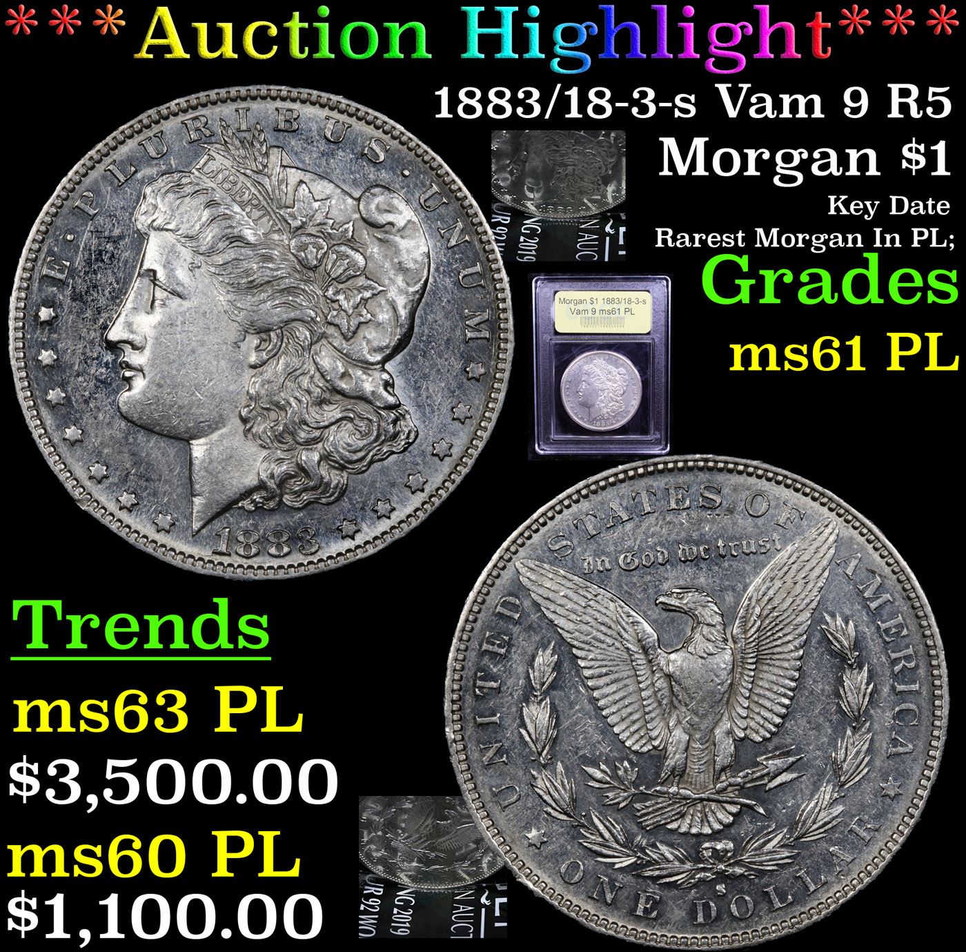 ***Auction Highlight*** 1883/18-3-s Vam 9 R5 Morgan Dollar $1 Graded Unc+ PL By USCG. The 1883-s is the rarest Morgan Dollar in PL with just over 50 examples known in PL and 2 in DMPL.. This sharply struck representative boasts fully mirrored fields and lightly frosted central devices. The luster is mainly brilliant with no hint of and toning. scattered abrasions define the grade.