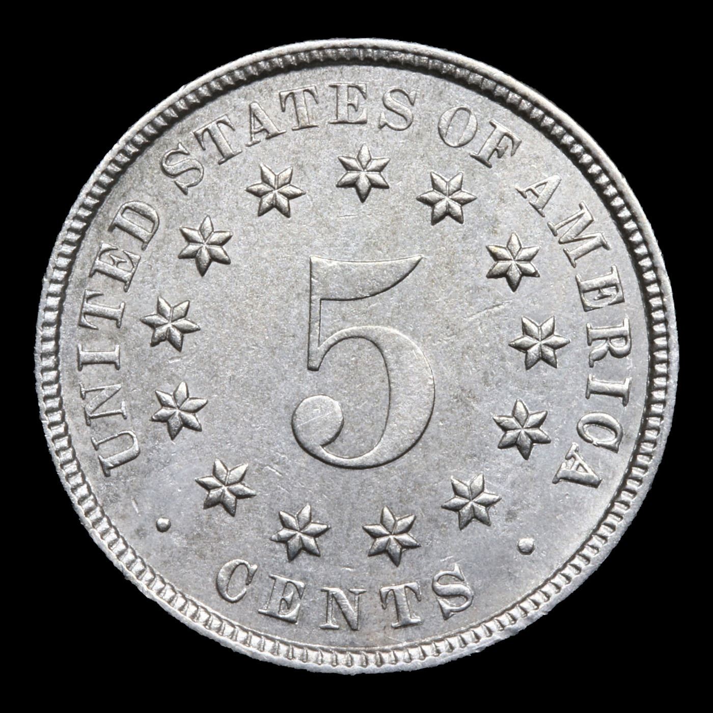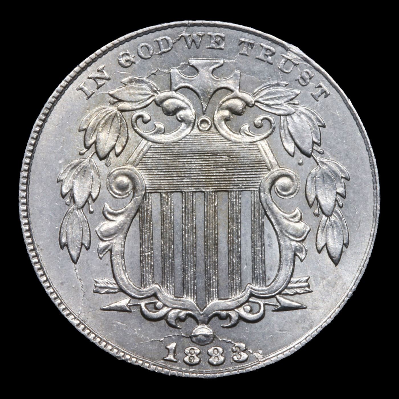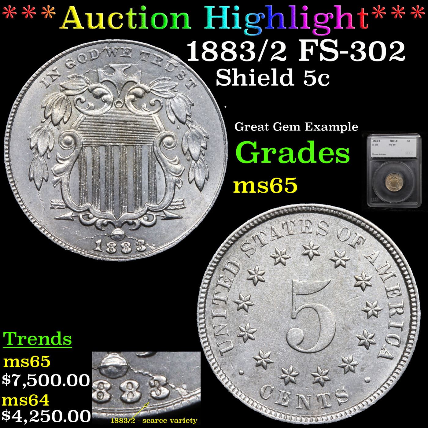 ***Auction Highlight*** 1883/2 FS-302 Shield Nickel 5c Graded ms65 By SEGS. The under type 2 is evident to the west of the primary 3 in the date, with the lower curve of the 2 most prominent. Remnants of the secondary digits are also visible inside the loops of both 8s, and a spidery die crack runs through the ball of the shield and the 3, identifying the scarce FS-302 overdate. The 1883, 3 over 2 variety is listed on page 133 of the 2017 Guide Book.The present coin is a high-end Gem, from the last year of the Shield design. The design elements are sharply detailed throughout, and the obverse shows an extensive network of interesting die cracks through the fields and the wreath. The mostly brilliant, well-preserved surfaces radiate satiny mint luster and show a few hints of golden-tan toning. A Corey's Pick, Bid to Win, Don't let it get Away, you might not find its equal Coin