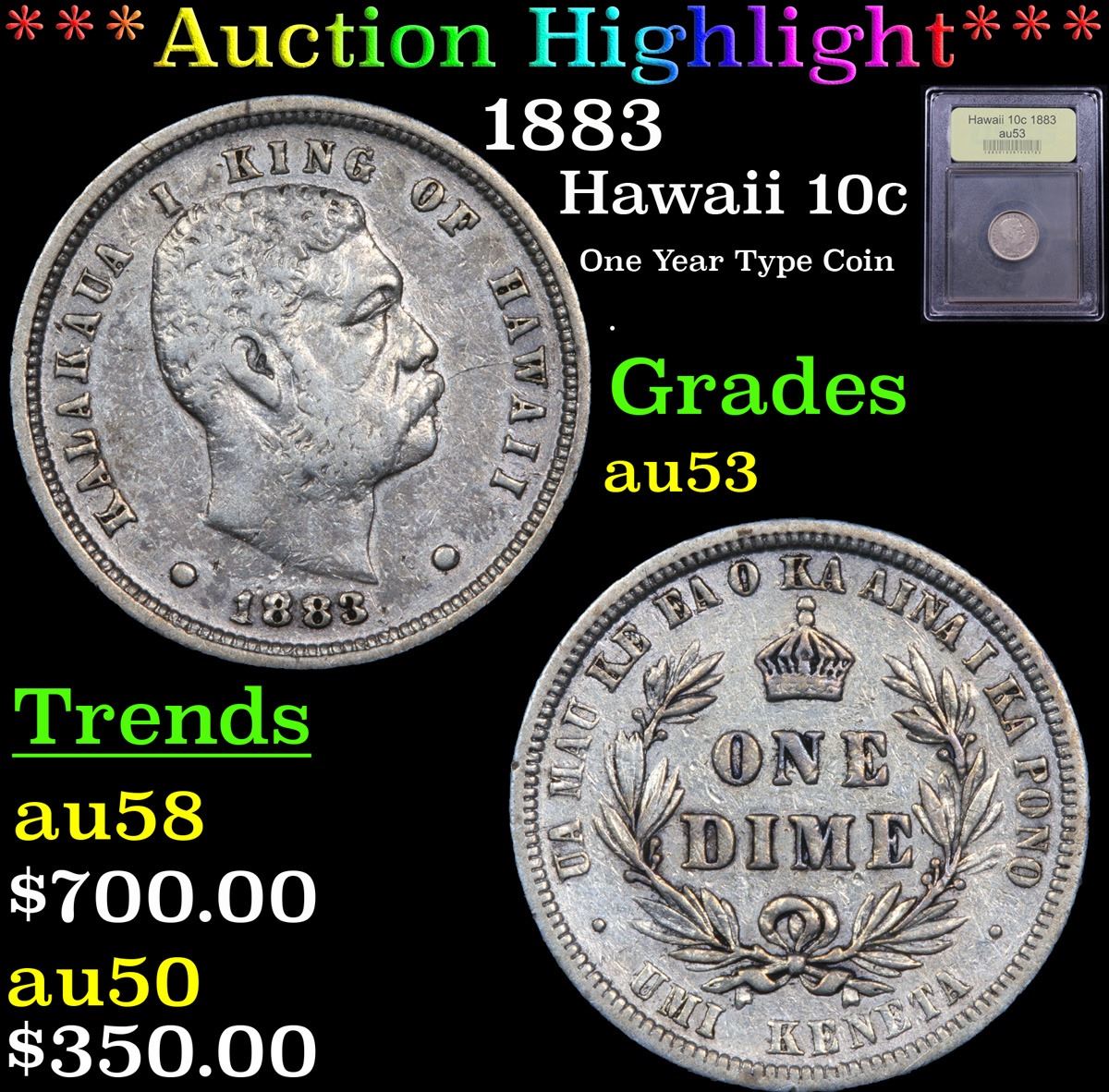 ***Auction Highlight*** 1883 Hawaii 10c Graded Select AU By USCG. 1883 10C Hawaii Ten Cents. The 1883 Hawaiian "umi keneta" was struck at the San Francisco Mint on U.S. dime planchets. Many were redeemed and melted after Hawaii acquired U.S. territorial status A Corey's Pick, Bid to Win Coin