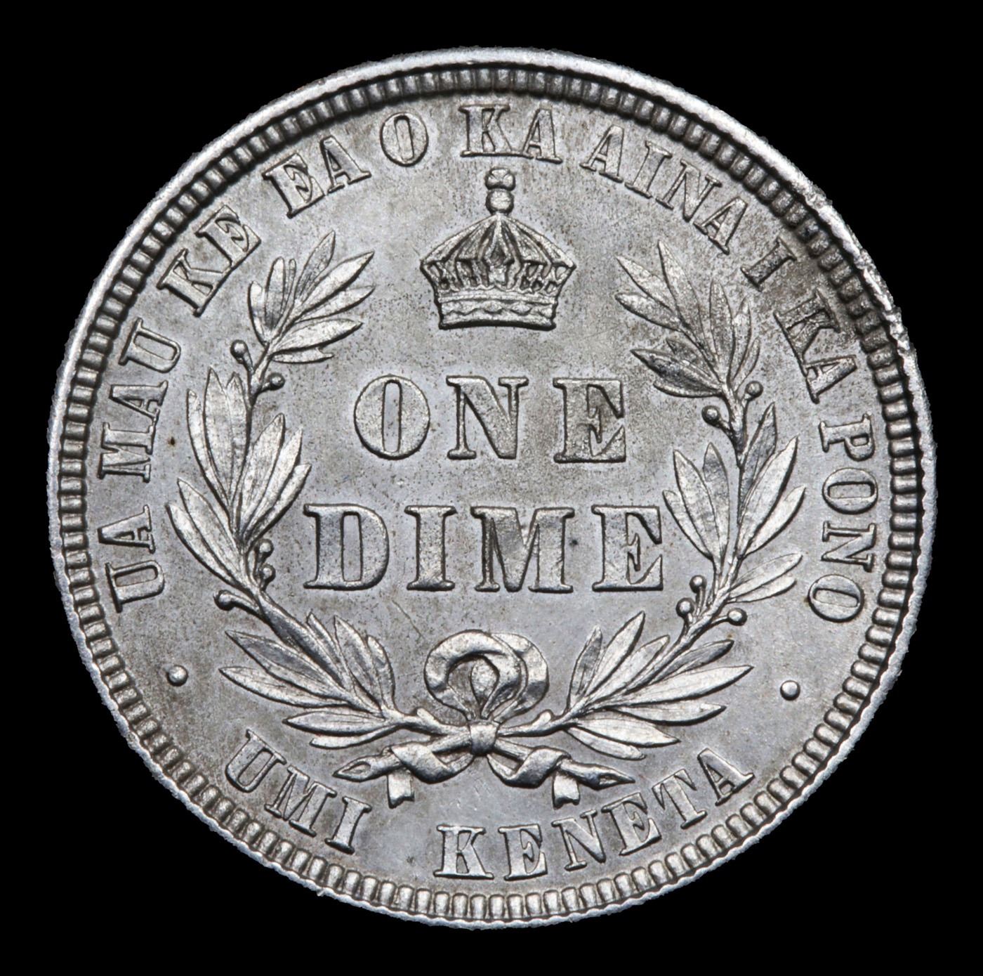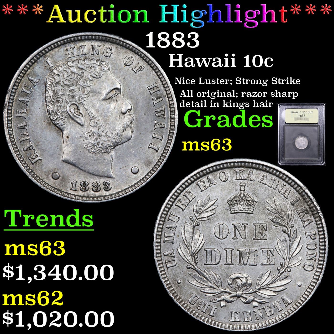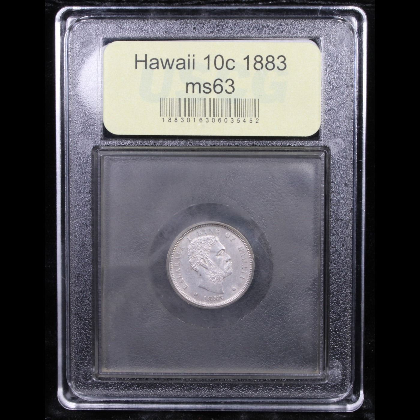 ***Auction Highlight*** 1883 Hawaii 10c Graded Select Unc By USCG. The 1883 Hawaiian "umi keneta" was struck at the San Francisco Mint on U.S. dime planchets. Many were redeemed and melted after Hawaii acquired U.S. territorial statusPer Maurice Gould and Kenneth Bressett writing in Hawaiian Coins, Tokens, and Paper Money (1961): "In 1883, Claus Spreckels, a banker, sugar planter, and power behind the throne, approached the King on the subject of having a silver coinage struck for the Islands. Application was made by the Hawaiian Government for the coinage at the San Francisco mint, of one million dollars in silver denominations to correspond with the silver coins of the United States of America in fineness and weight, regulations of the 9th of November, 1883, by the Secretary of the United States Treasury." Ultimately, 250,000 Hawaiian Dimes were struck in 1883. A Corey's Pick, Bid to Win, Don't let it get Away Coin