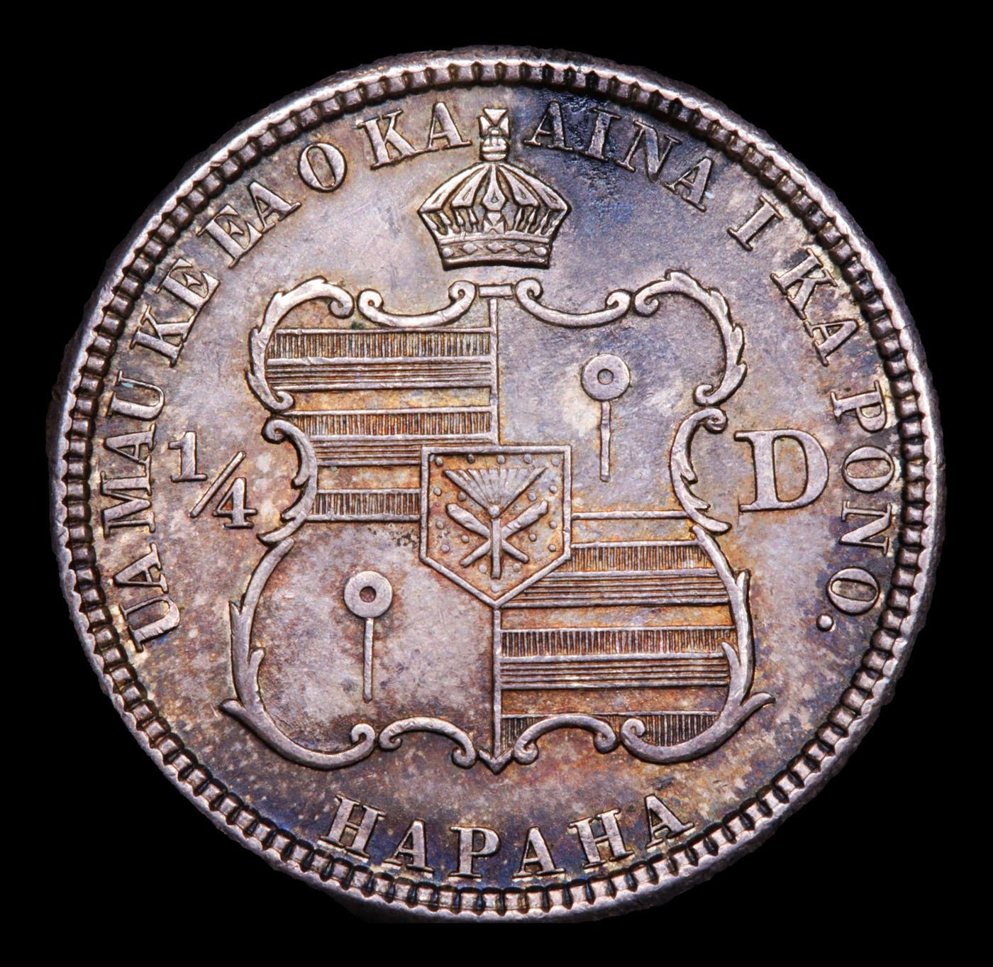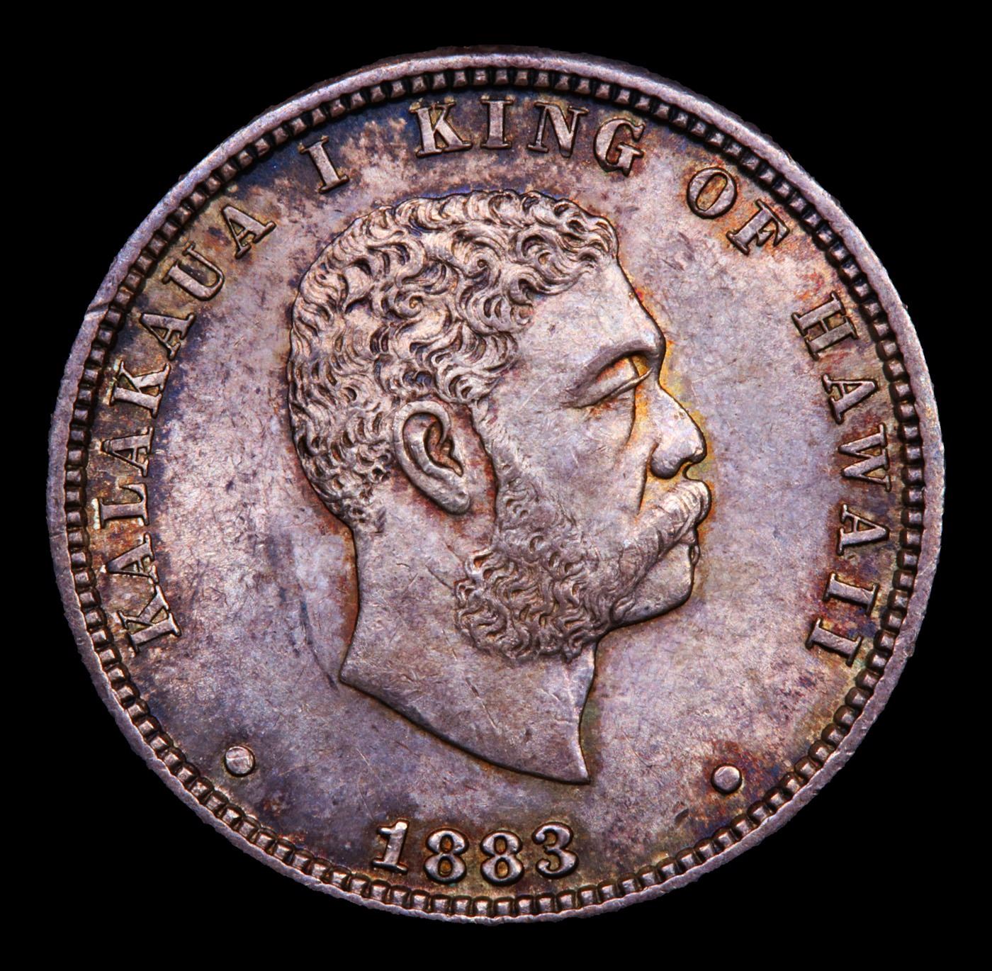 Per Maurice Gould and Kenneth Bressett writing in Hawaiian Coins, Tokens, and Paper Money (1961): "In 1883, Claus Spreckels, a banker, sugar planter, and power behind the throne, approached the King on the subject of having a silver coinage struck for the Islands. Application was made by the Hawaiian Government for the coinage at the San Francisco mint, of one million dollars in silver denominations to correspond with the silver coins of the United States of America in fineness and weight, regulations of the 9th of November, 1883, by the Secretary of the United States Treasury." Ultimately, 500,000 Hawaiian quarters were struck in 1883. A Corey's Pick, Bid to Win Coin