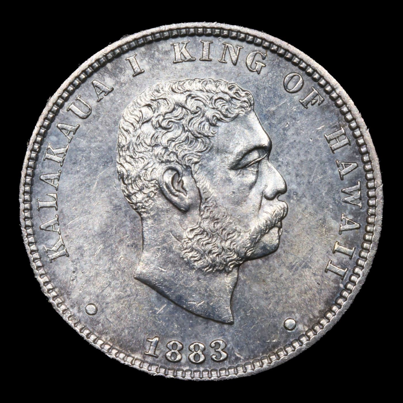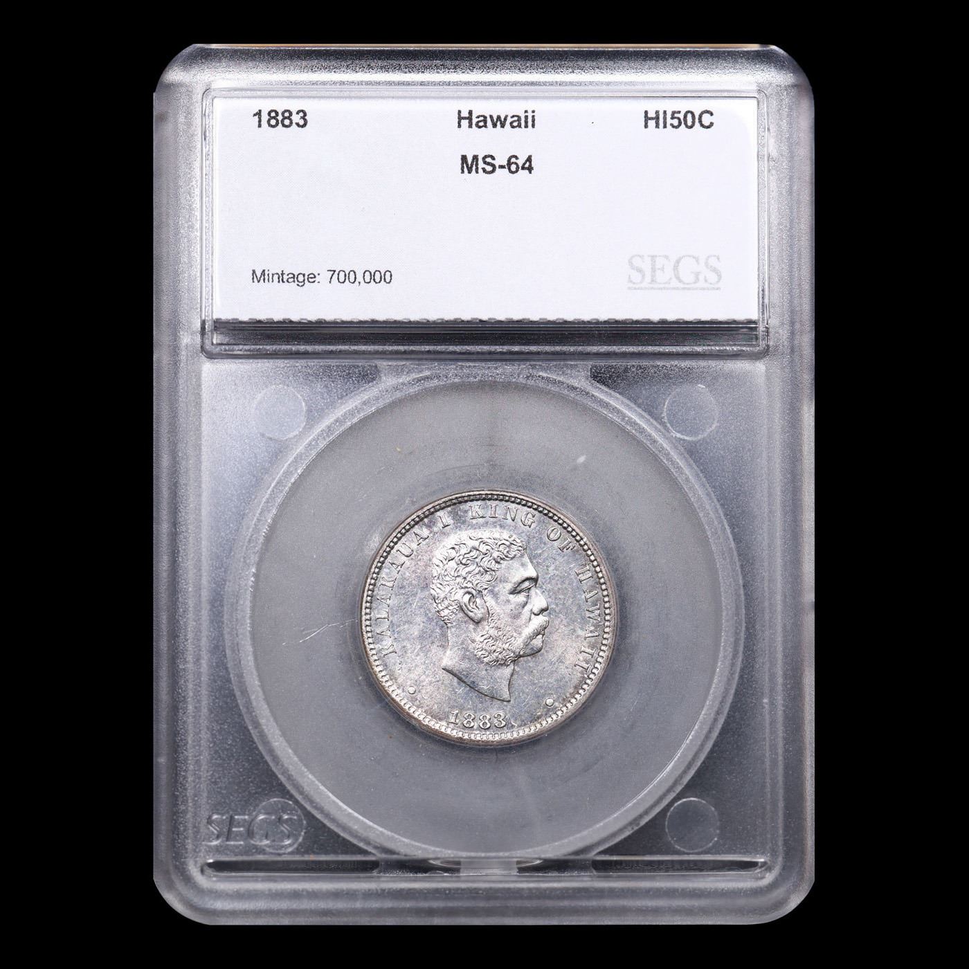 ***Auction Highlight*** 1883 Hawaii Hawaii Half Dollar 50c Graded ms64 BY SEGS. Hawaiian coins made for circulation in the islands include the 1847 One Cent coins and the 1883 silver issues. In 1883, dimes, quarters, half dollars, and dollars were struck at the U.S. Mint at Philadelphia for Hawaii. These coins display a bust of the King David Kalakaua. The sizes of the coins match those of United States coins and, although the Hawaiian coins bore unusual Hawaiian denominations, they were valued the same as their U.S. counterparts.