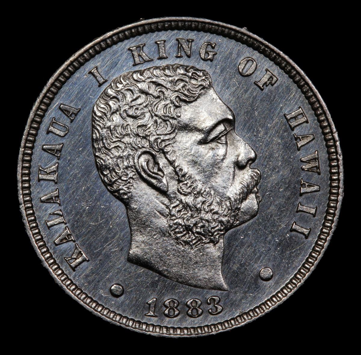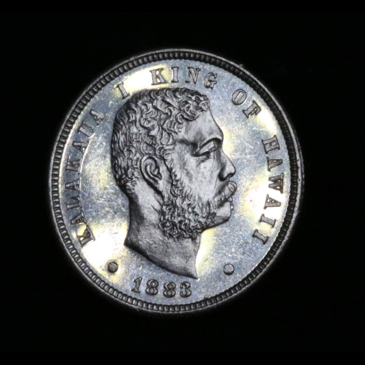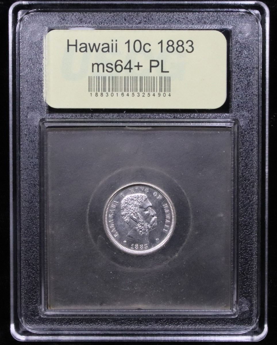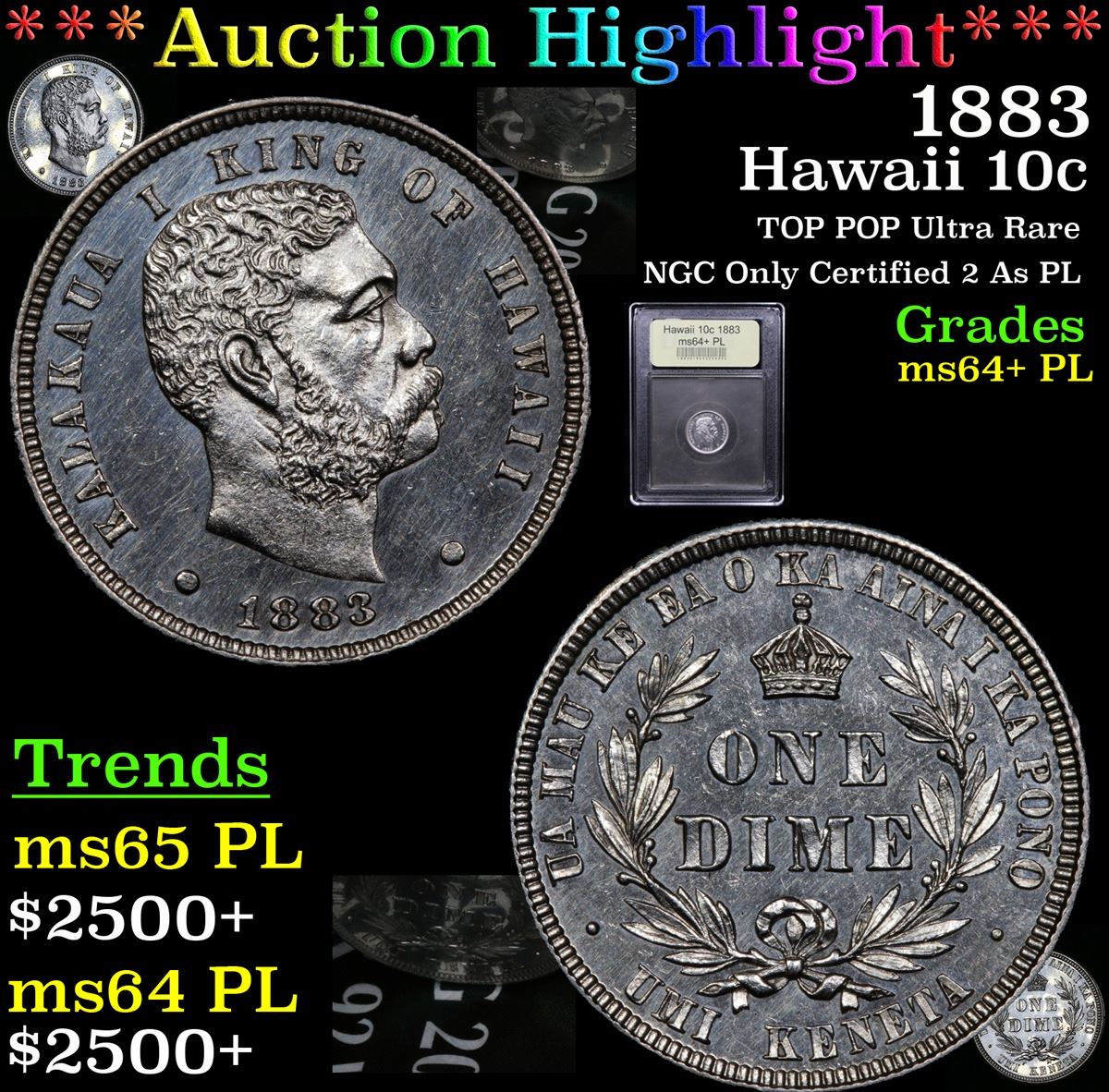 ***Auction Highlight*** 1883 TOP POP Ultra Rare NGC Only Certified 2 As PL Old Commem Dime 10c Graded Choice Unc+ PL By USCG. Ultra Rare Proof Like 1883 Hawaii 10c Dime. To days NGC has certified 2 of the 1883 50c Halves as PL, and 4 of the 1883 25c Quarters as PL, and ZERO of the 10c Dimes. PCGS has certified 1 25c as PL, and 1 50c as PL and again zero as pl in the 10c denomination. This is a definite PL example. Mirrored Fields. And therefore the TOP POP in this ultra rare and highly popular and sought coin. As far as some background, he is part of the story. In the early 1880’s Under the farsighted rule of the cosmopolitan King Kalakaua (1874-91), Under the farsighted rule of the cosmopolitan King Kalakaua (1874-91), who sought to bring the islands up to Western standards of development, representatives from various foreign mints were interviewed on the subject of a contract coinage. This move alarmed sugar magnate Claus Spreckels, whose influence in the islands made him a virtual second king. Certain that Hawaii was vital to the interests of both himself and the United States, he persuaded Kalakaua to have the desired silver coins struck by the USA to American standards. The latter provision was a key selling point, as the use of standard USA coin planchets lowered the cost of this coinage. The master hubs and dies for this coinage were prepared by the United States Mint’s Chief Engraver, Charles Barber. He worked from designs submitted by Spreckels and subsequently modified by Mint Director Horatio C. Burchard A Corey's Pick, Bid to Win, Don't let it get Away, you might not find its equal Coin. I give this coin my highest recommendation