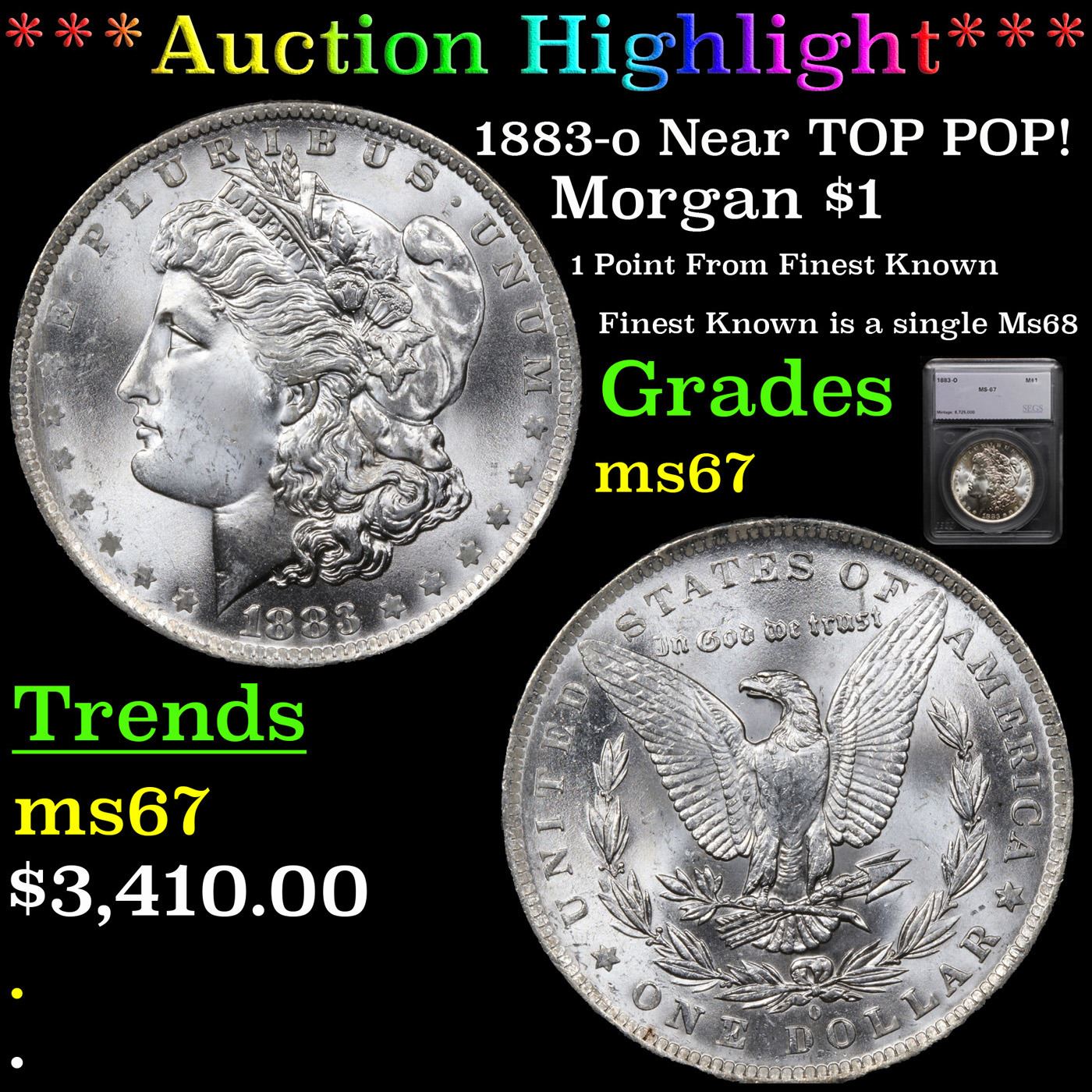 ***Auction Highlight*** 1883-o Near TOP POP! Morgan Dollar $1 Graded ms67 By SEGS. A Corey's Pick, Bid to Win, Don't let it get Away, you might not find its equal Coin