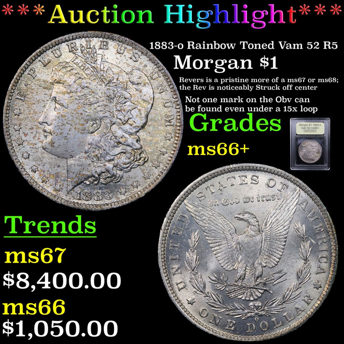***Auction Highlight*** 1883-o Rainbow Toned Vam 52 R5 Morgan Dollar $1 Graded GEM++ Unc By USCG. A higher mintage issue for its type with 8,725,000 pieces produced, the 1883-O is common in Mint State but is incredibly scarce in grades above MS-66, as offered here. This Superb Gem is a significant offering and numbers among the finer examples known.. It will be perfect for a world-class collection of America's favorite silver dollar series. A Corey's Pick, Bid to Win, Don't let it get Away, you might not find its equal Coin