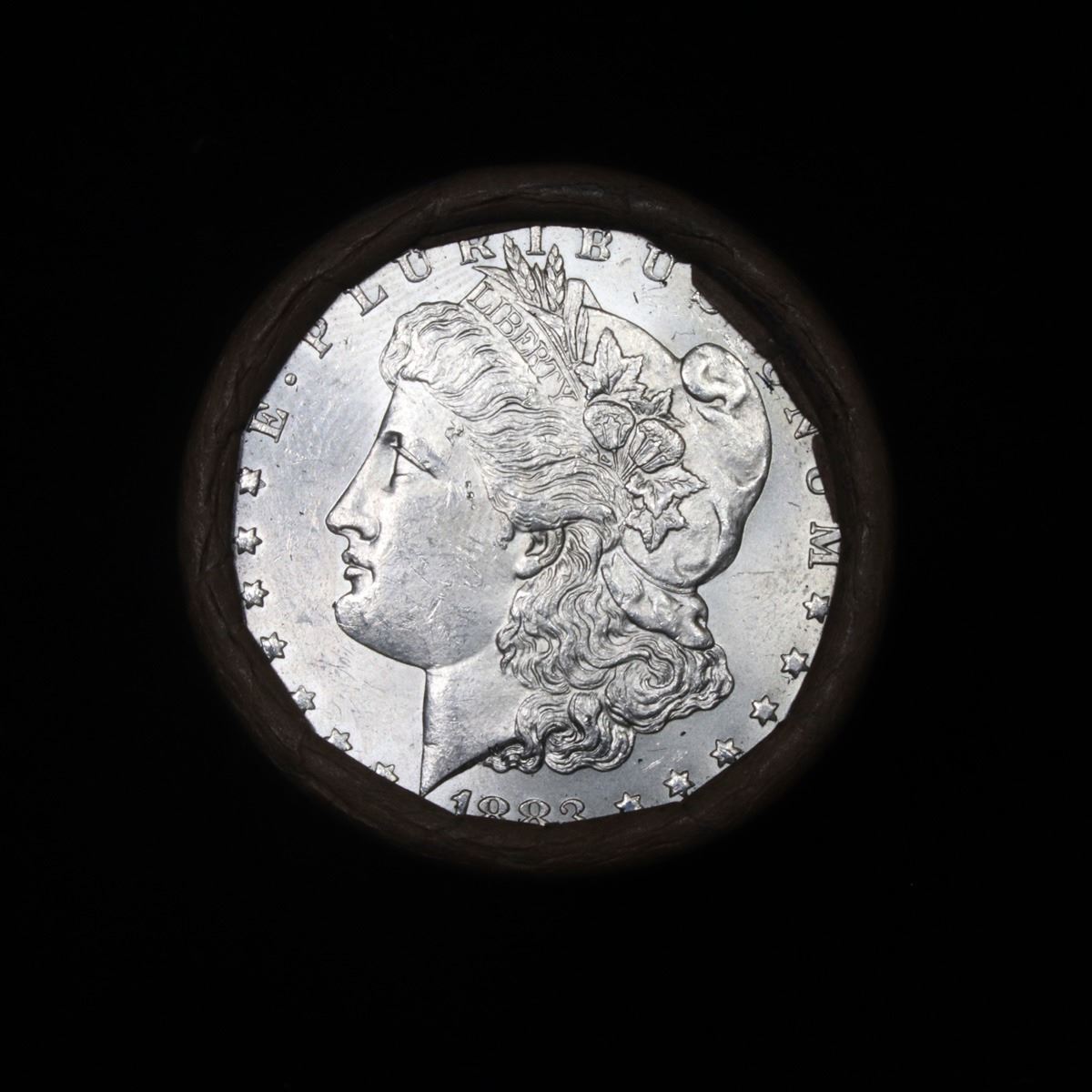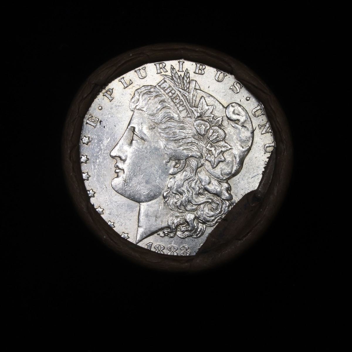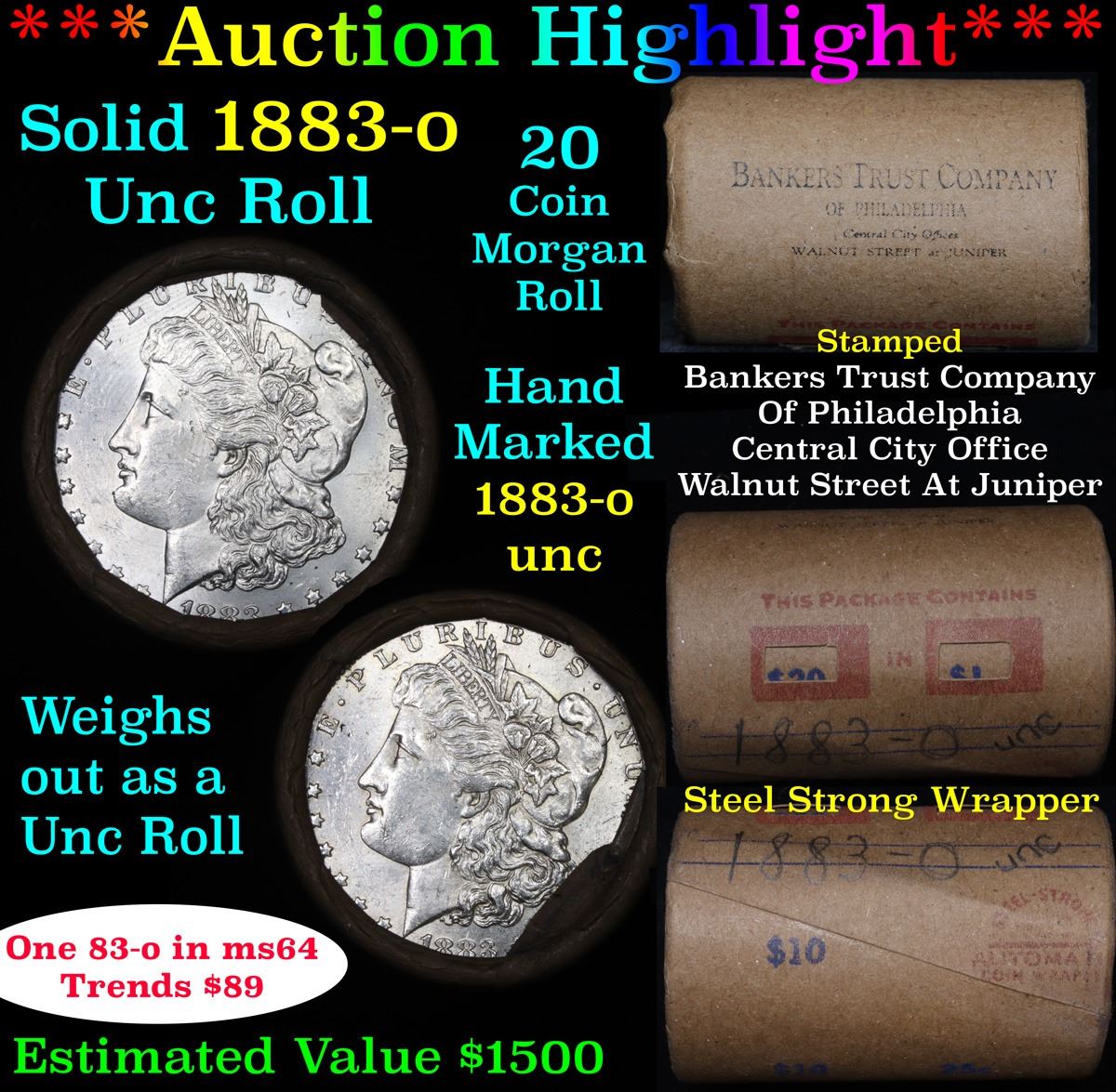 ***Auction Highlight*** 1883-o Uncirculated Morgan Dollar Shotgun Roll. This roll is held in an old Steel strong wrapper, patented 1921, stamped "Bankers Trust Company of Philadelphia, Walnut Street at Juniper. 1883-o Uncirculated Morgan Dollar Roll, Superb Ends. Weighs Perfectly as an Uncirculated Roll. Trends lists ms64 at $89 and ms63 at $75.
