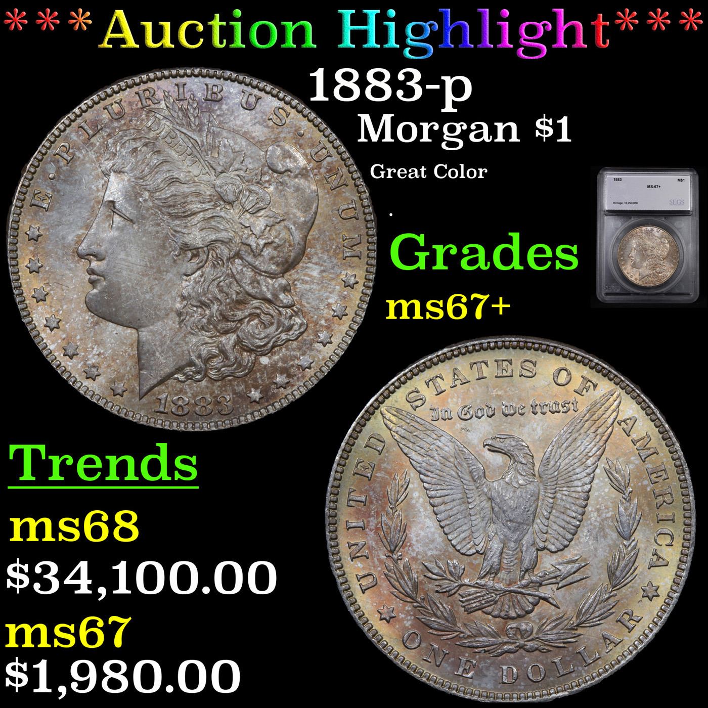 ***Auction Highlight*** 1883-p Morgan Dollar $1 Graded ms67+ By SEGS. A Corey's Pick, Bid to Win, Don't let it get Away, you might not find its equal Coin