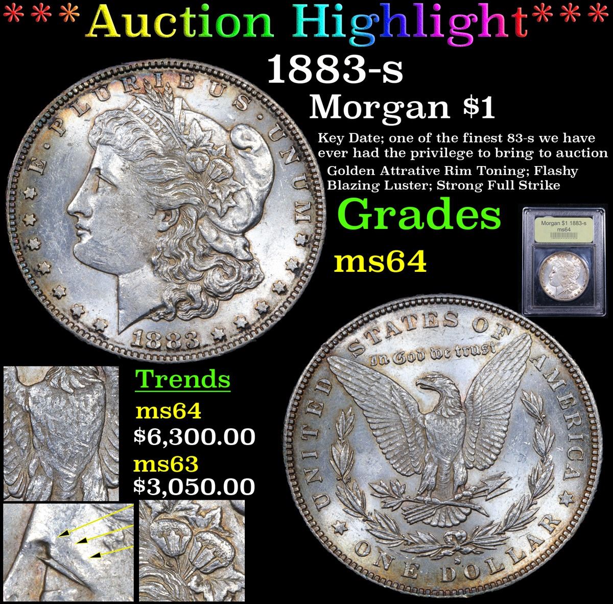 ***Auction Highlight*** 1883-s Morgan Dollar $1 Graded Choice Unc By USCG. Up for Auction is a Spectacular 1883-s Key date Morgan. Golden attractive rim toning, Flashy blazing luster, incredibly strong Full strike. This is one of the finest 1883-s we have ever had the privilege to bring to auction. Must see in hand to appreciate and the picture itself looks wonderful! High well peaked eyebrow, great breast feathers, and wonderful detail in the cotton bolls. A Corey's Pick, Bid to Win, Don't let it get Away, you might not find its equal Coin. I give this coin my highest recommendation