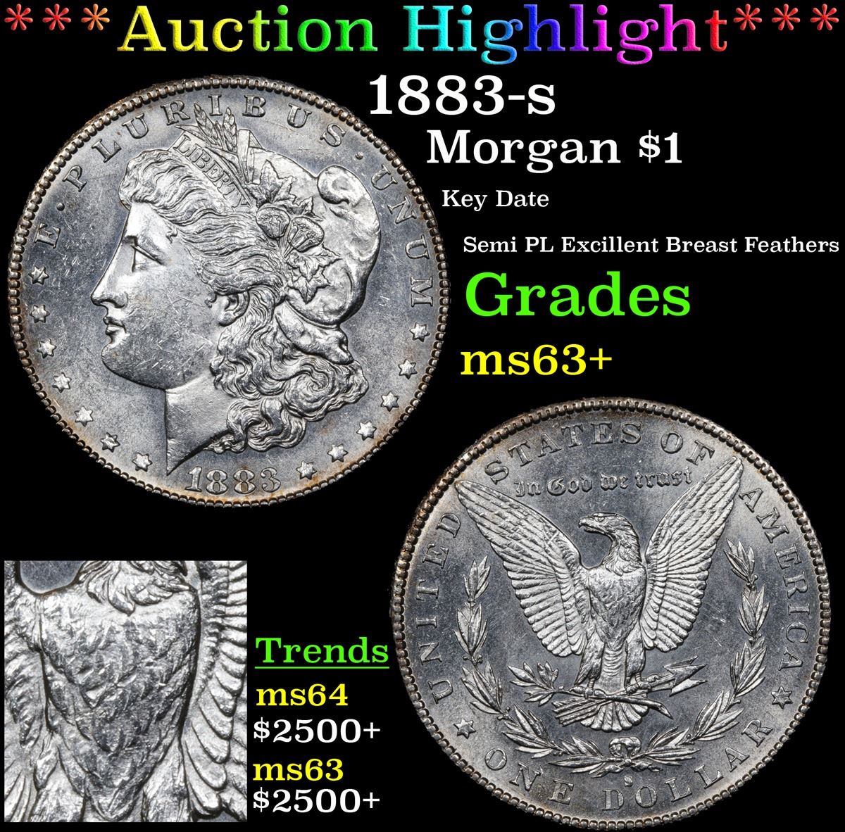 ***Auction Highlight*** 1883-s Key Date Semi PL Excillent Breast Feathers Morgan Dollar $1 Grades Select+ Unc.
