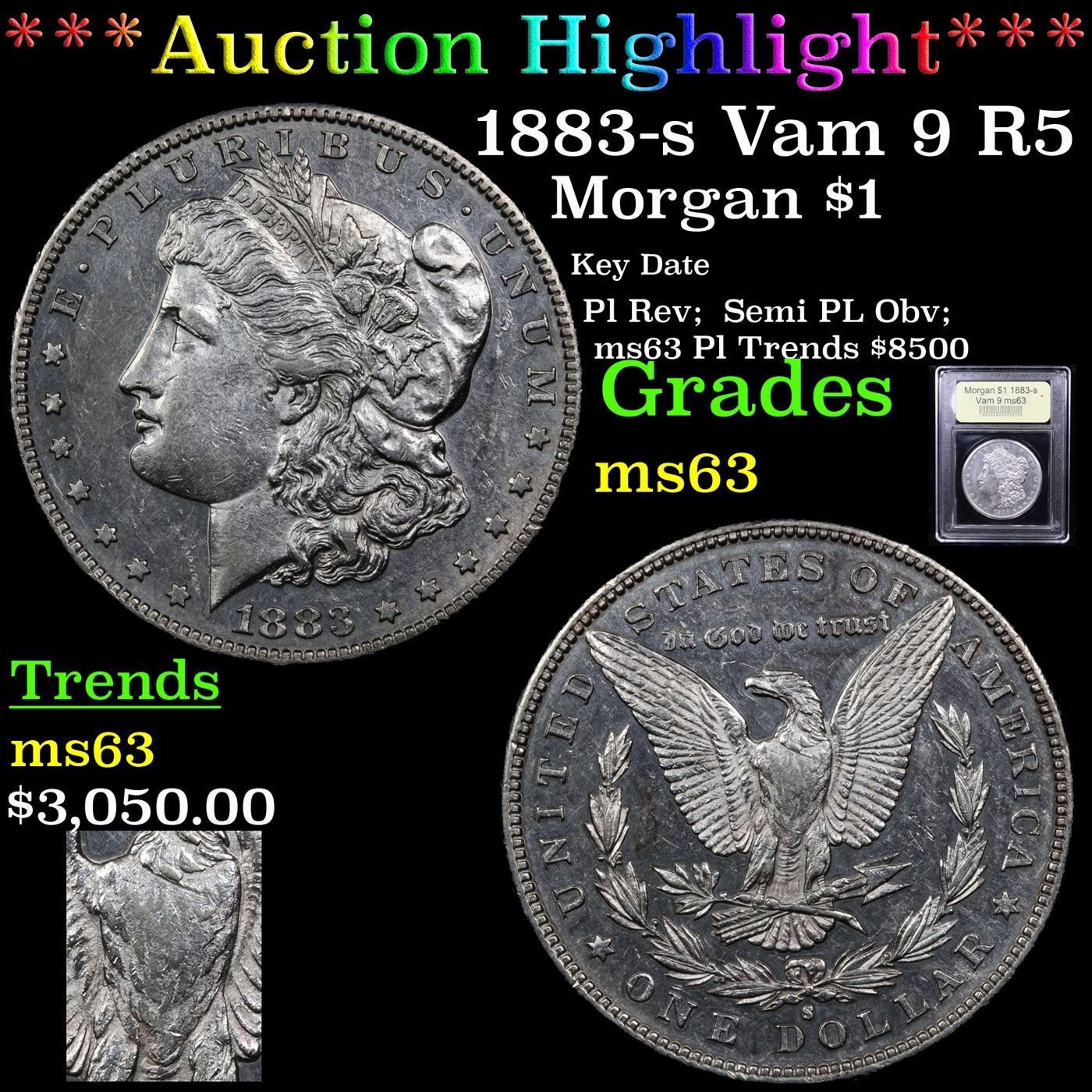***Auction Highlight*** 1883-s Vam 9 R5 Morgan Dollar $1 Graded Select Unc By USCG. The 1883-S is one of the rarest dates in the Morgan dollar series in Proof like grades. PCGS lists only 23 examples in this category, and just two Deep Mirror Proof like examples. The present coin is arguably a Proof like cameo on the reverse, but the obverse fields are not quite as reflective, and thus the Proof like designation must be held to Semi PL. The strike is sharp with good breast feathers and the motifs are nicely frosted. Scattered abrasions limit the grade to ms63 Semi PL A Corey's Pick, Bid to Win, Don't let it get Away, you might not find its equal Coin