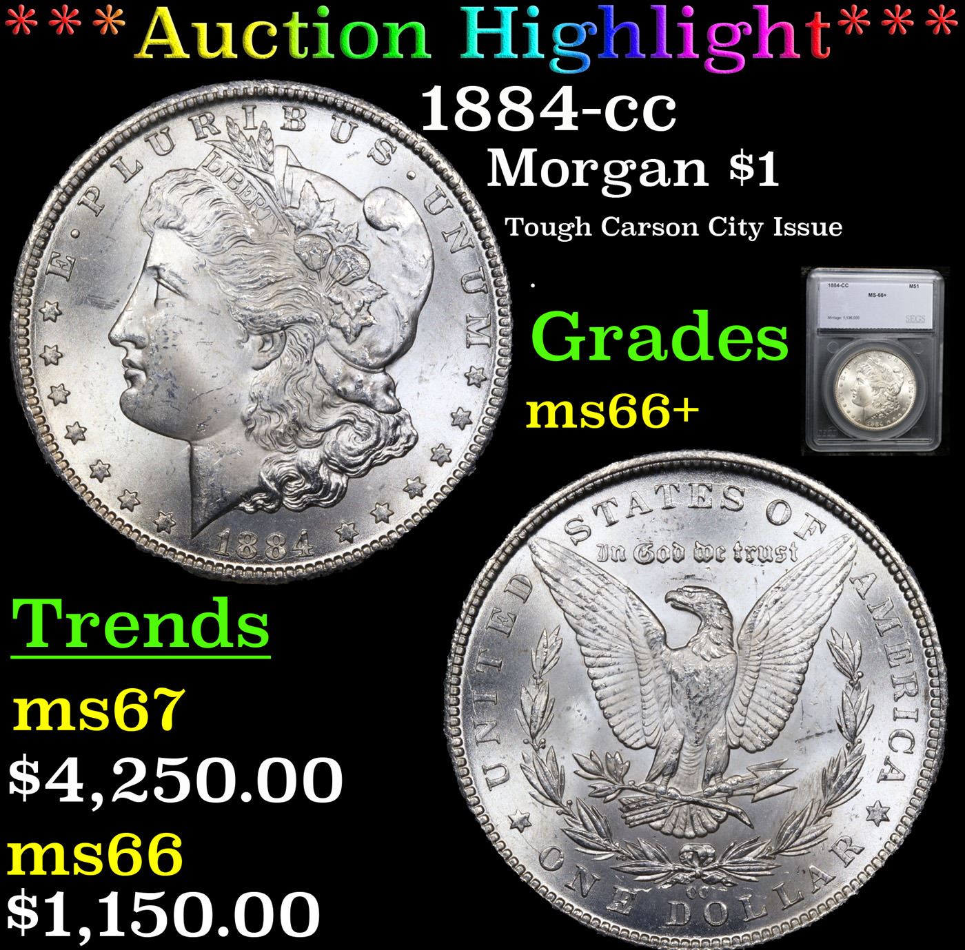 ***Auction Highlight*** 1884-cc Morgan Dollar $1 Graded ms66+ By SEGS.