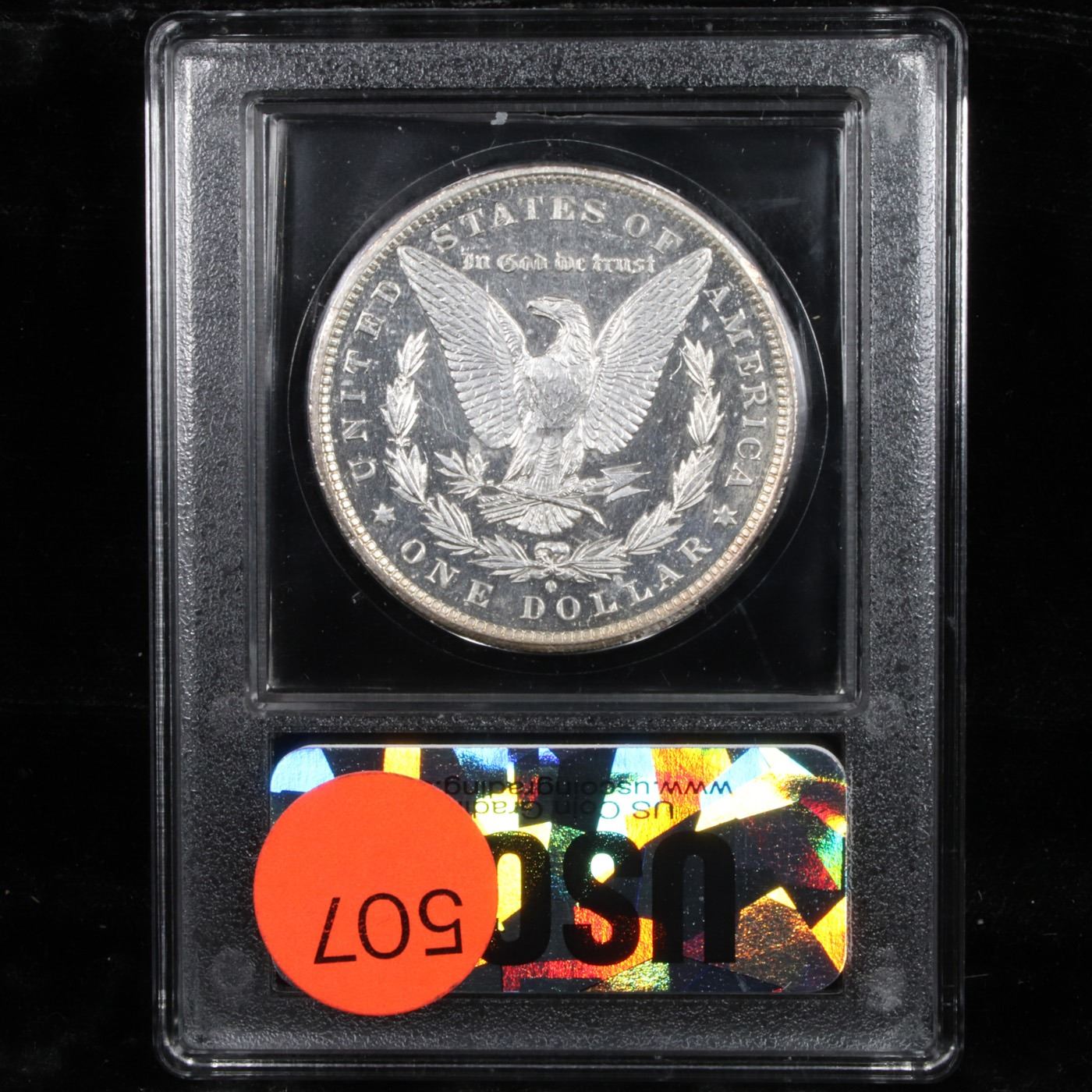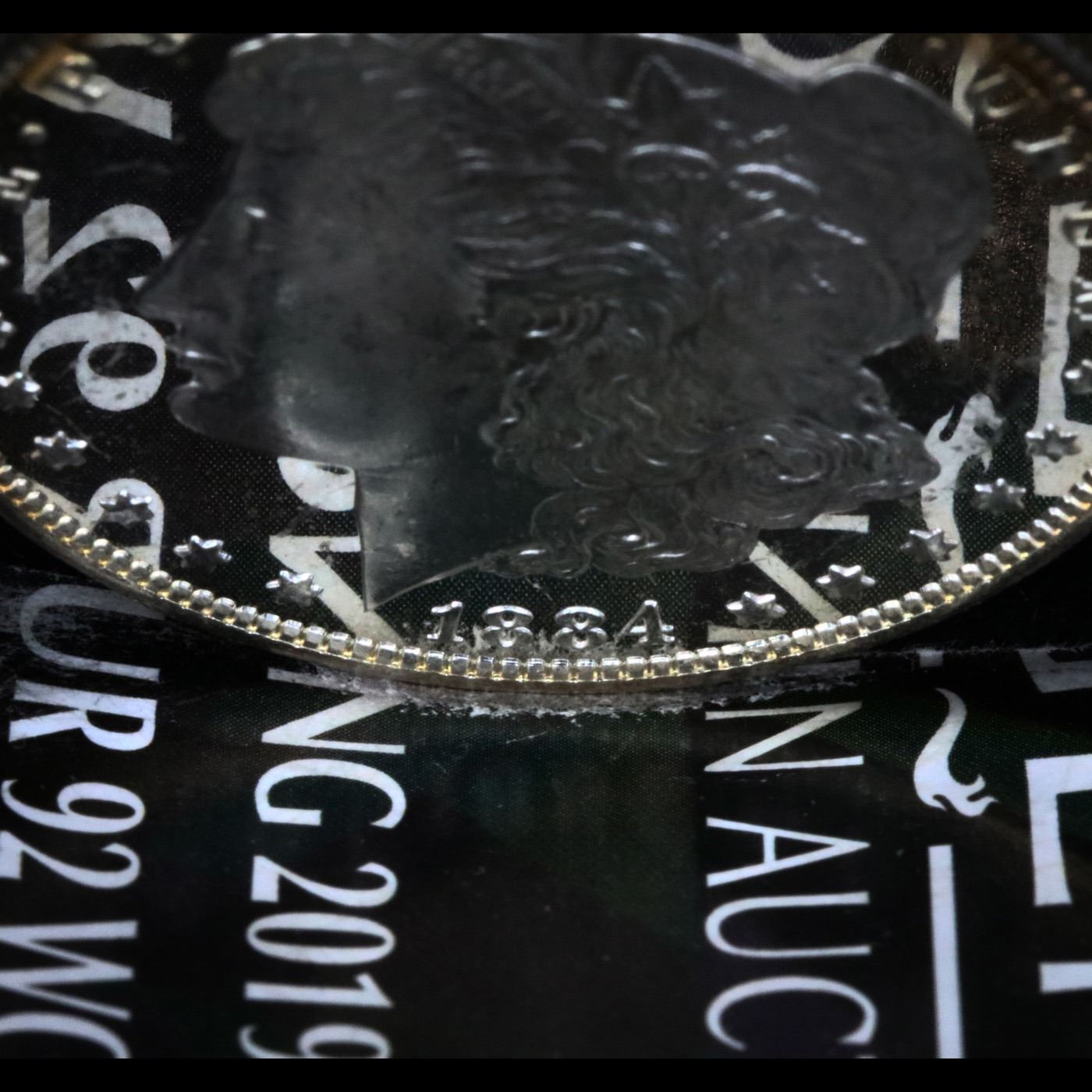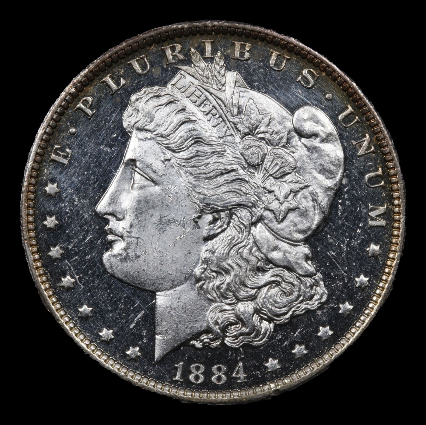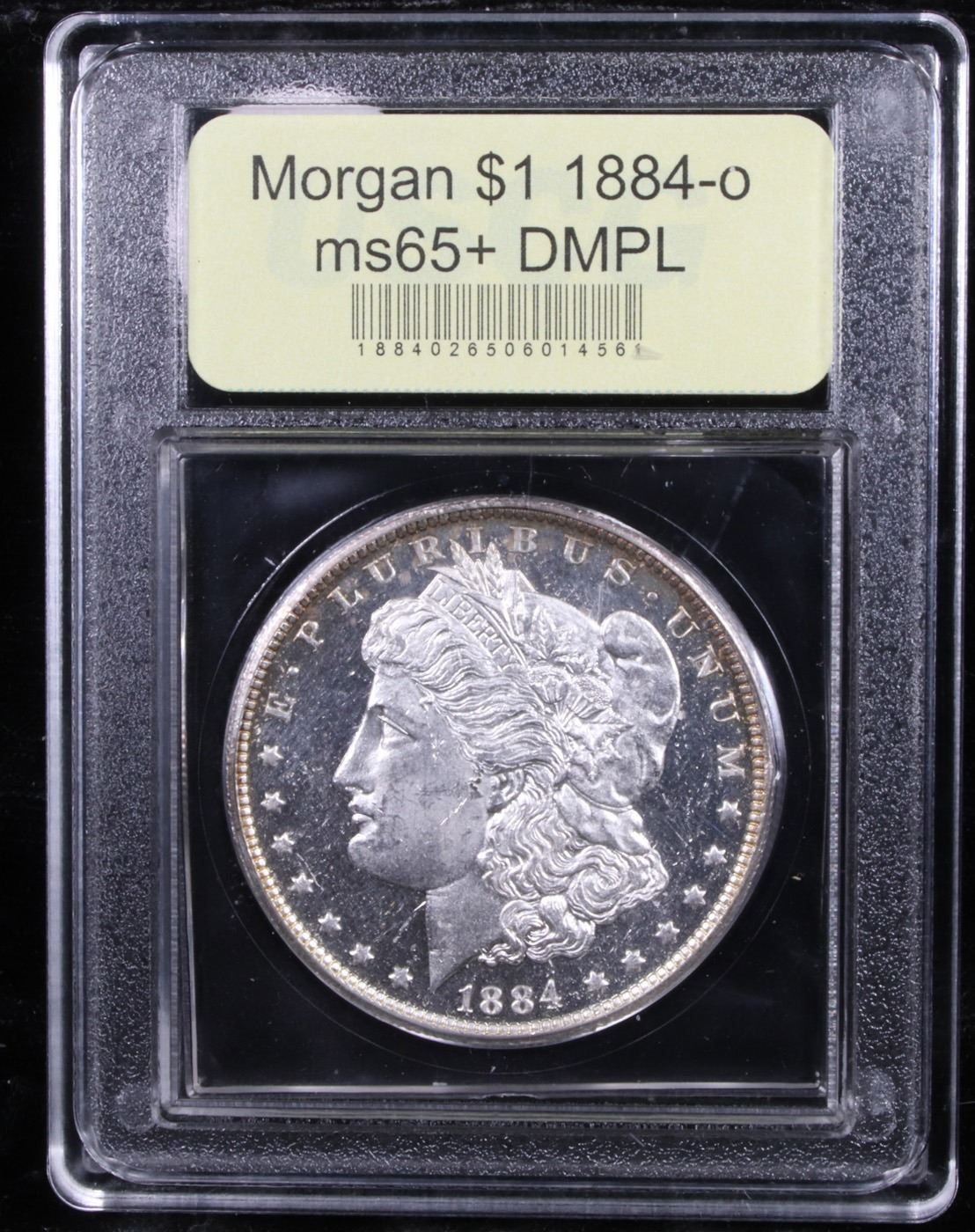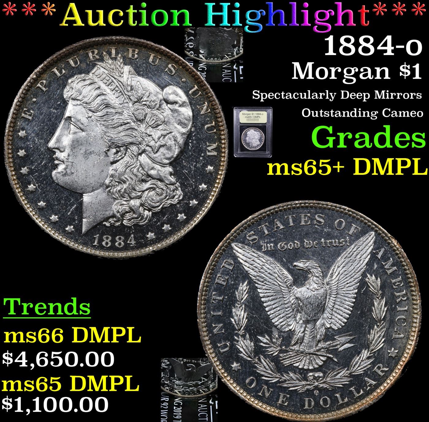 ***Auction Highlight*** 1884-o Morgan Dollar $1 Graded GEM+ DMPL By USCG.   0    Crisply impressed, frosty-textured devices contrast markedly with glassy reflectivity in the fields. There is only the lightest pale-gold iridescence in evidence, and most angles reveal a brilliant-white coin. A lovely Gem DPL Morgan dollar.