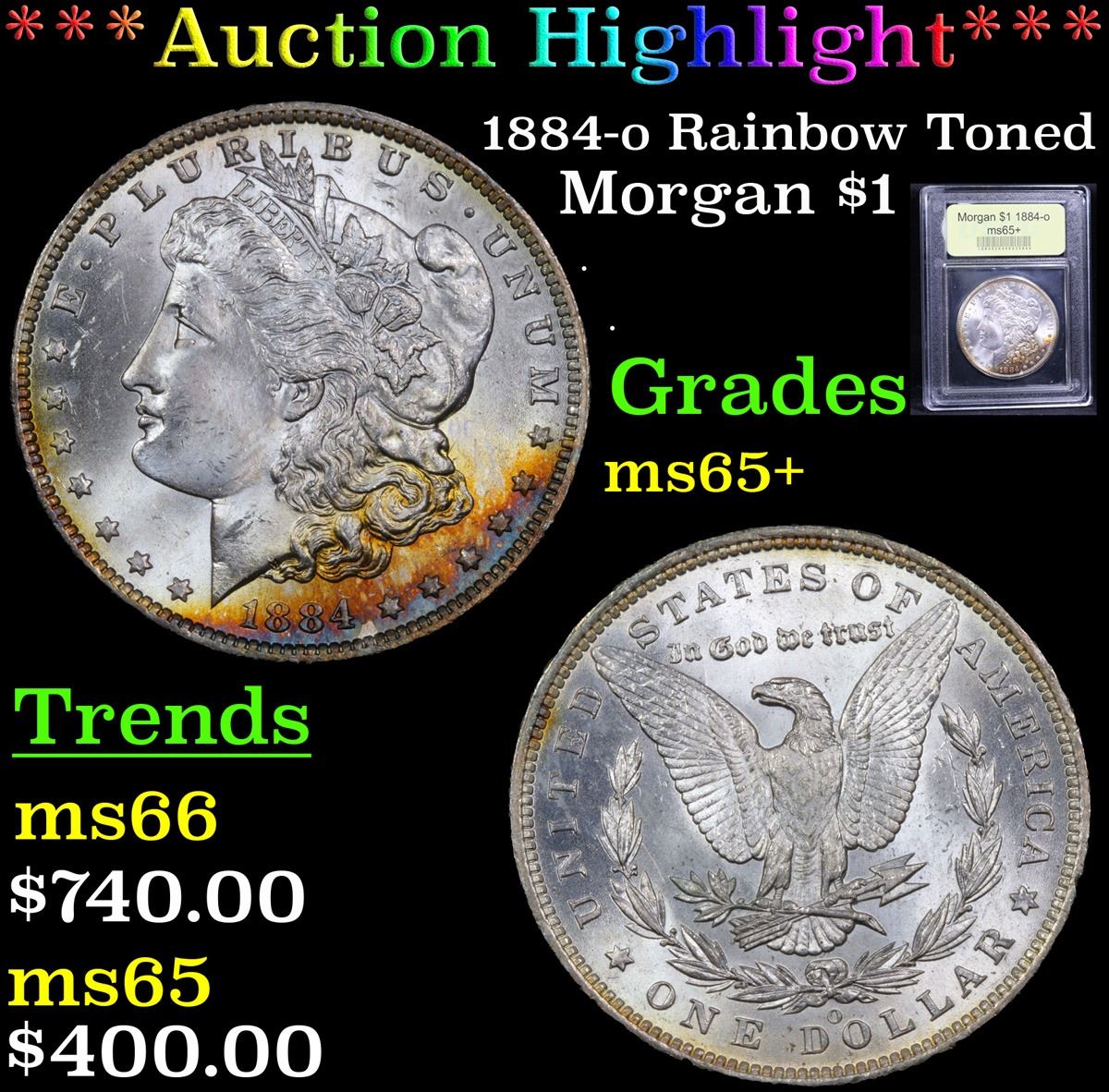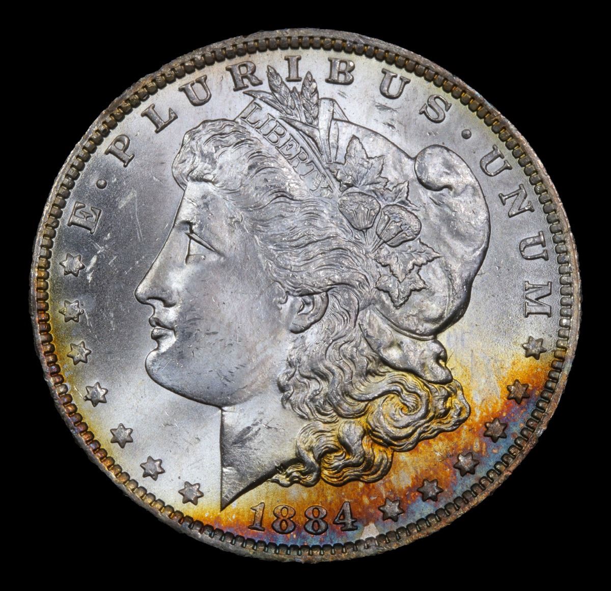 ***Auction Highlight*** 1884-o Rainbow Toned Morgan Dollar $1 Graded GEM+ Unc By USCG. A Corey's Pick, Bid to Win Coin