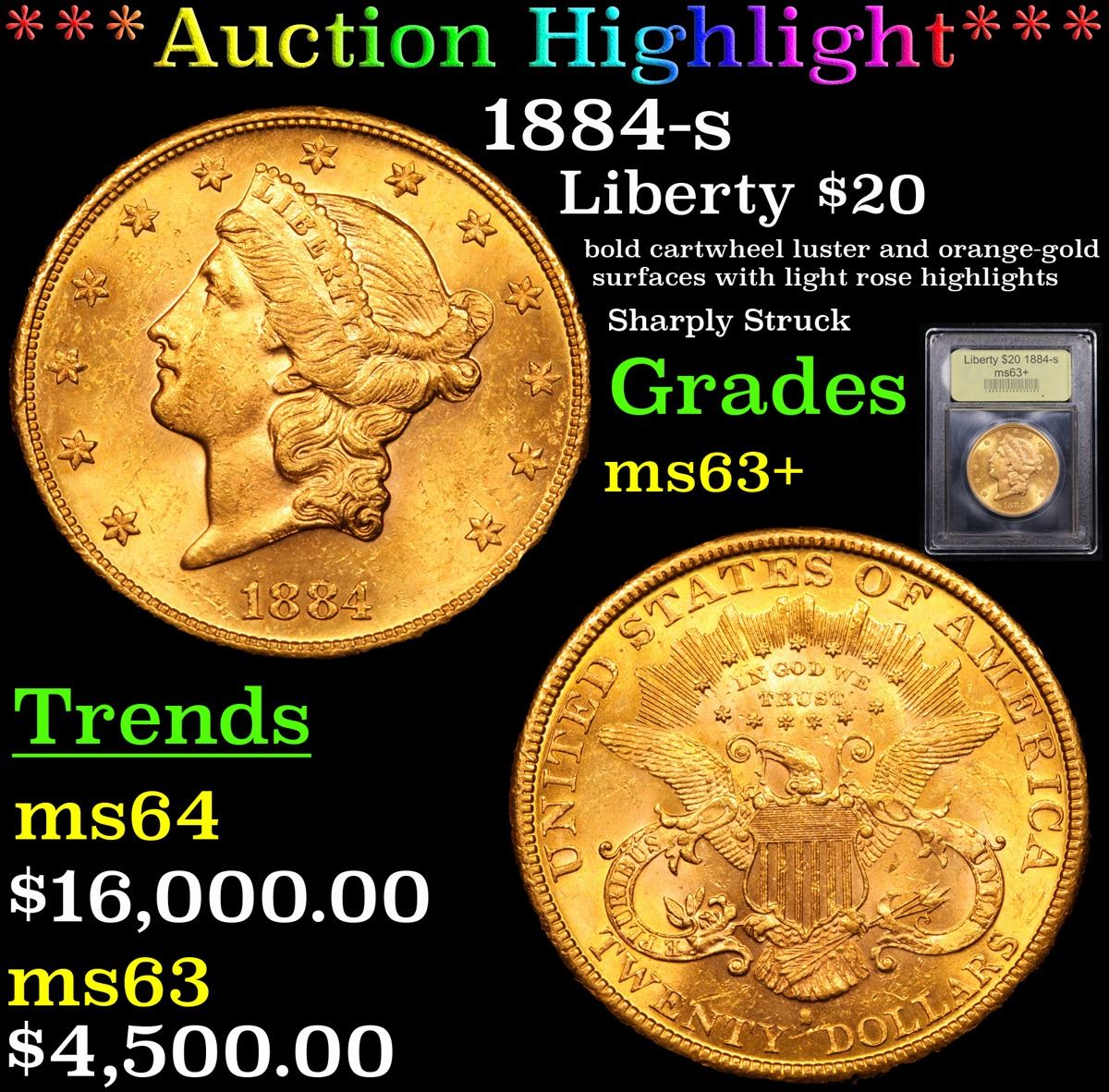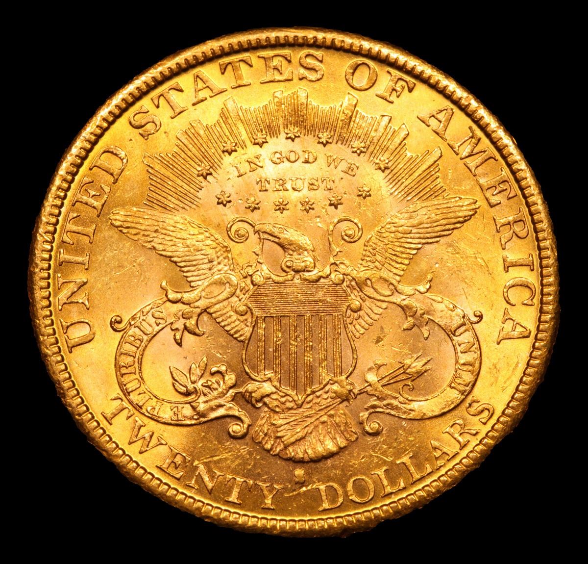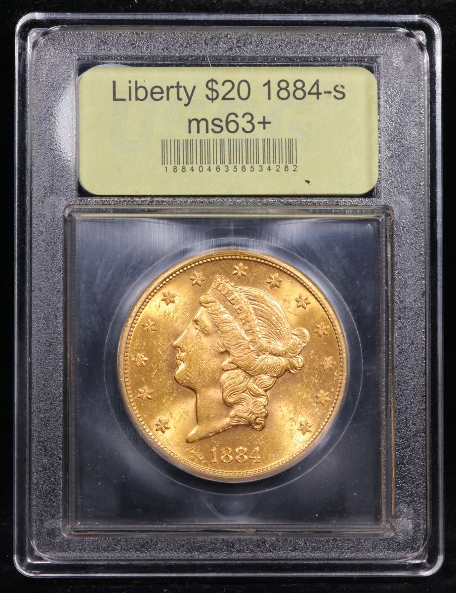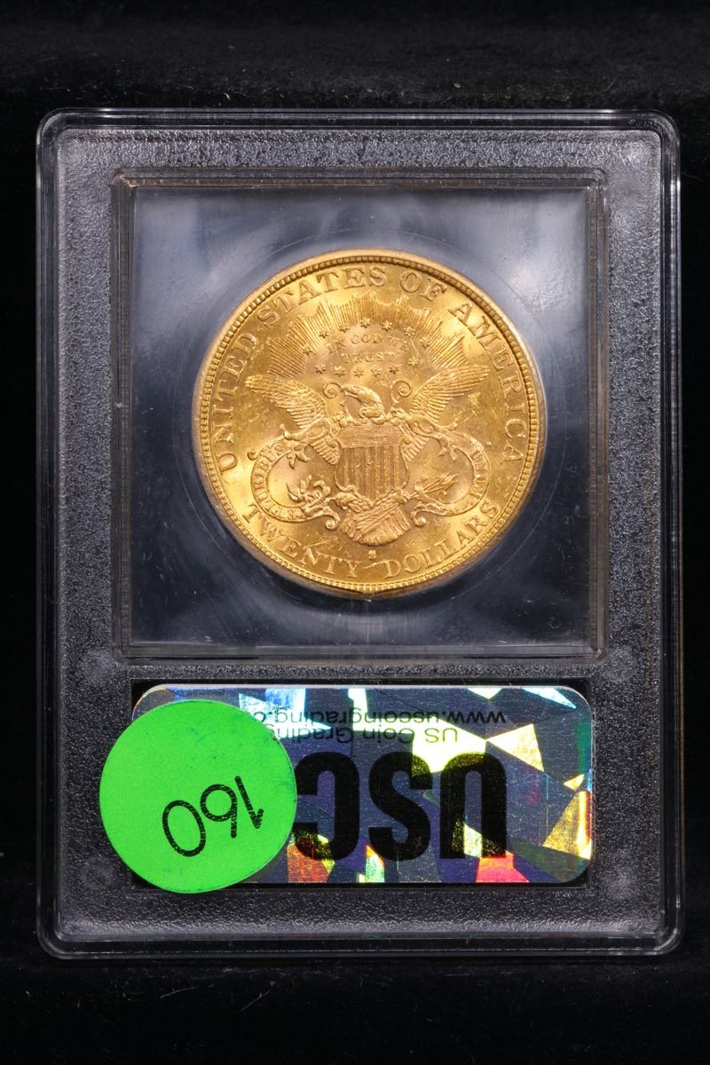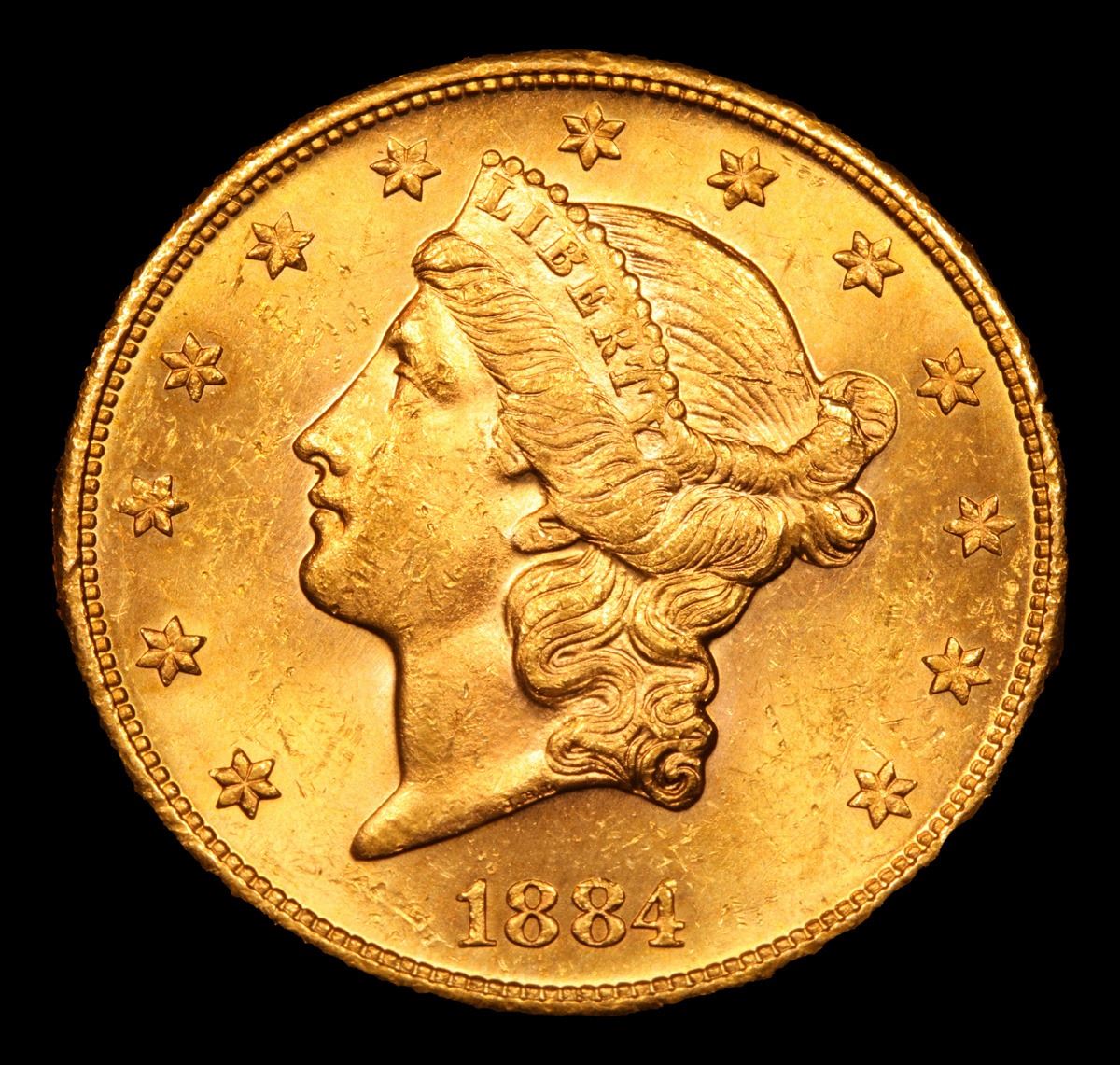 ***Auction Highlight*** 1884-s Gold Liberty Double Eagle $20 Graded Select+ Unc By USCG. This impressive San Francisco Mint double eagle displays bold cartwheel luster and orange-gold surfaces with light rose highlights. Sharply struck and exceptionally attractive, this issue is one of the best produced pre-1900 Type 3 Liberty double eagles and would make a prized addition to an advanced collector's set. Collecting Liberty double eagles by date and mint has been a very popular pursuit in recent times. This enthusiasm has been engendered by several factors. First, large and impressive double eagle coins are interesting to own and provide a store of value because of their gold content. Second, the availability of Mint State coins from three different treasure ships, the S.S. Central America (sunk in 1857), S.S. Brother Jonathan (1865), and S.S. Republic (1865), has widely expanded interest in this denomination. There are more than just a few numismatists who have just one double eagle in their "collection" -- the 1857-S from the Central America. However, going beyond that many have used such a coin as a catalyst to add others. A third factor is that a collection of Liberty double eagles cannot be formed overnight as cherrypicking is recommended for quality. Because of this, enthusiasts can look forward to spending several years or even more gathering suitable examples. A Corey's Pick, Bid to Win, Don't let it get Away, you might not find its equal Coin. I give this coin my highest recommendation