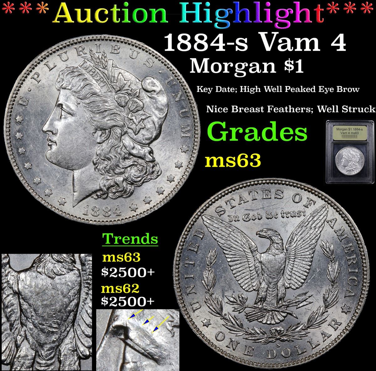 ***Auction Highlight*** 1884-s Vam 4 Morgan Dollar $1 Graded Select Unc By USCG. Up for auction is a terrific example of the ultra Rare Key Date Morgan the, 1884-s. Superb frosty luster, well struck with nice breast feathers and great eye appeal. A Corey's Pick, Bid to Win, Don't let it get Away, you might not find its equal Coin. I give this coin my highest recommendation