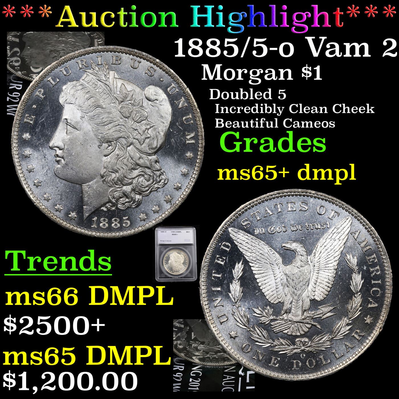 ***Auction Highlight*** 1885/5-o Vam 2 Morgan Dollar $1 Graded ms65+ dmpl By SEGS. A Corey's Pick, Bid to Win, Don't let it get Away Coin