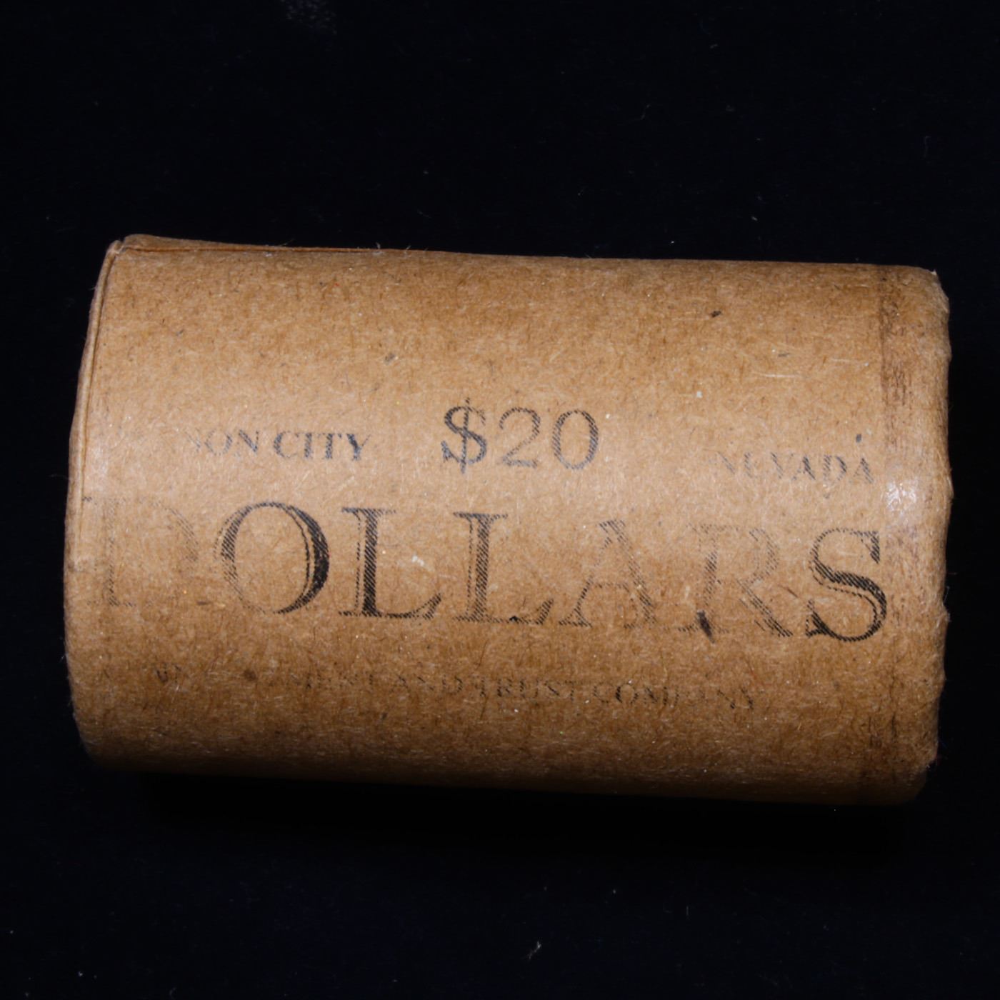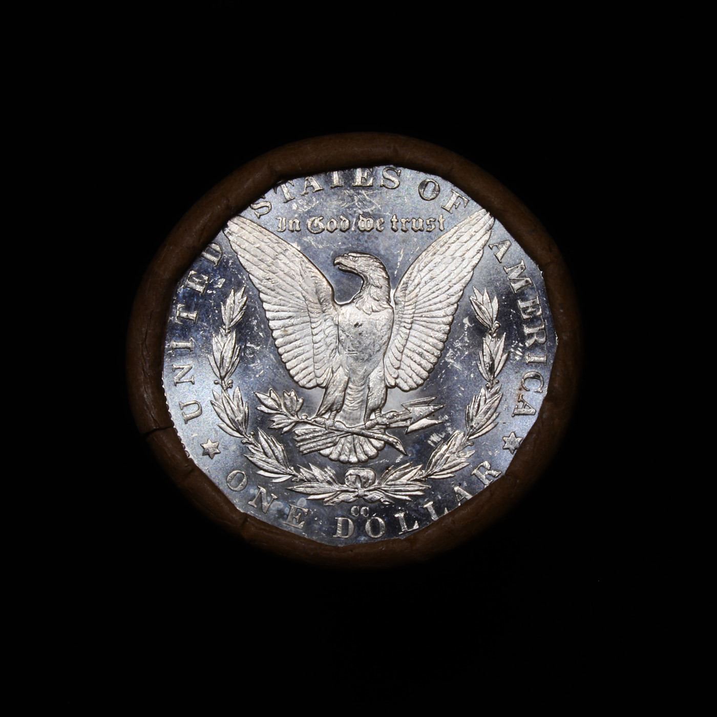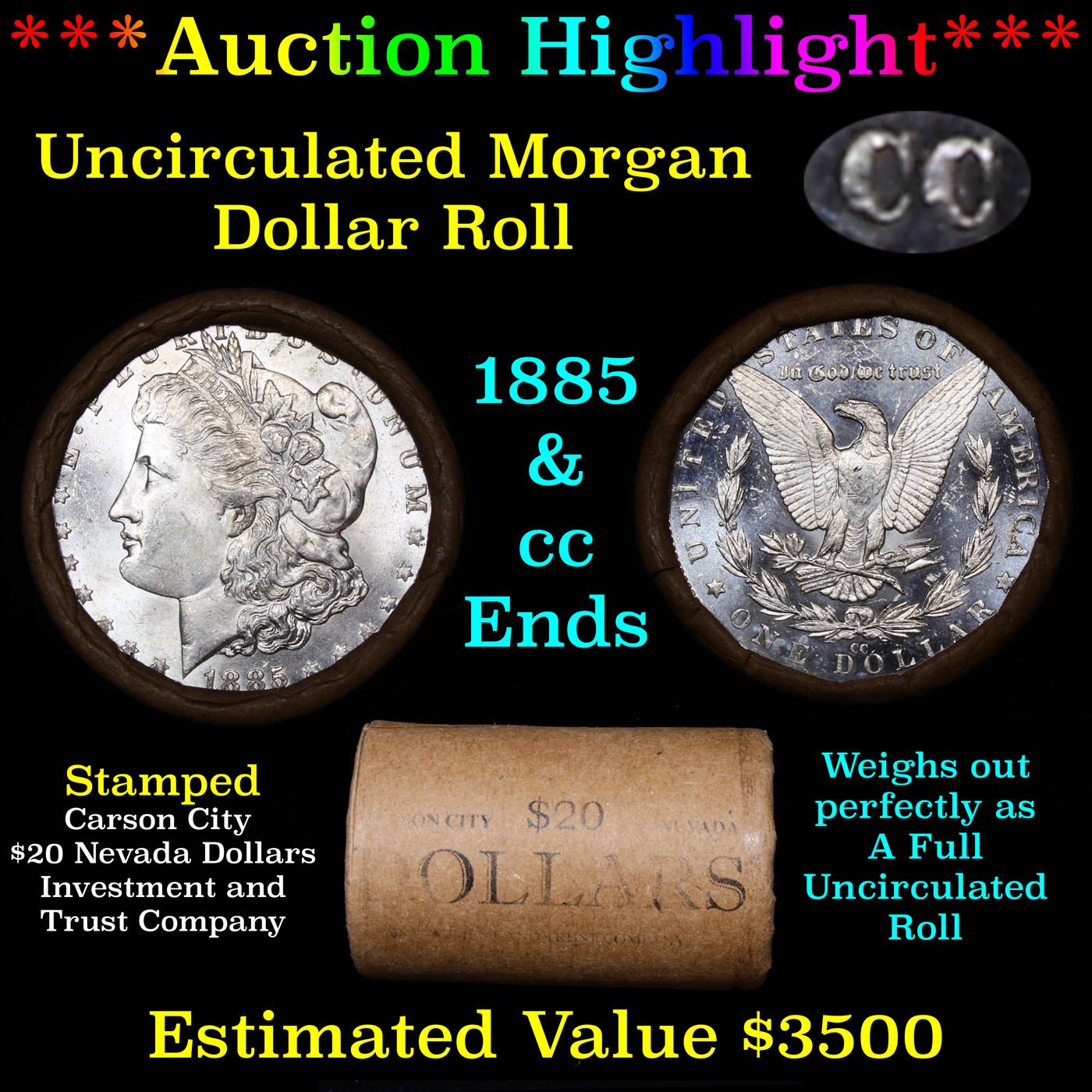 ***Auction Highlight*** 1885 & CC Uncirculated Morgan Dollar Shotgun Roll DMPL reverse. Uncirculated Morgan Dollar Roll, Superb Ends, Carson City, Nevada Investment and Trust Co wrapper. Weighs Perfectly as a Uncirculated Roll. Deep Mirror Proof like 'cc' end.