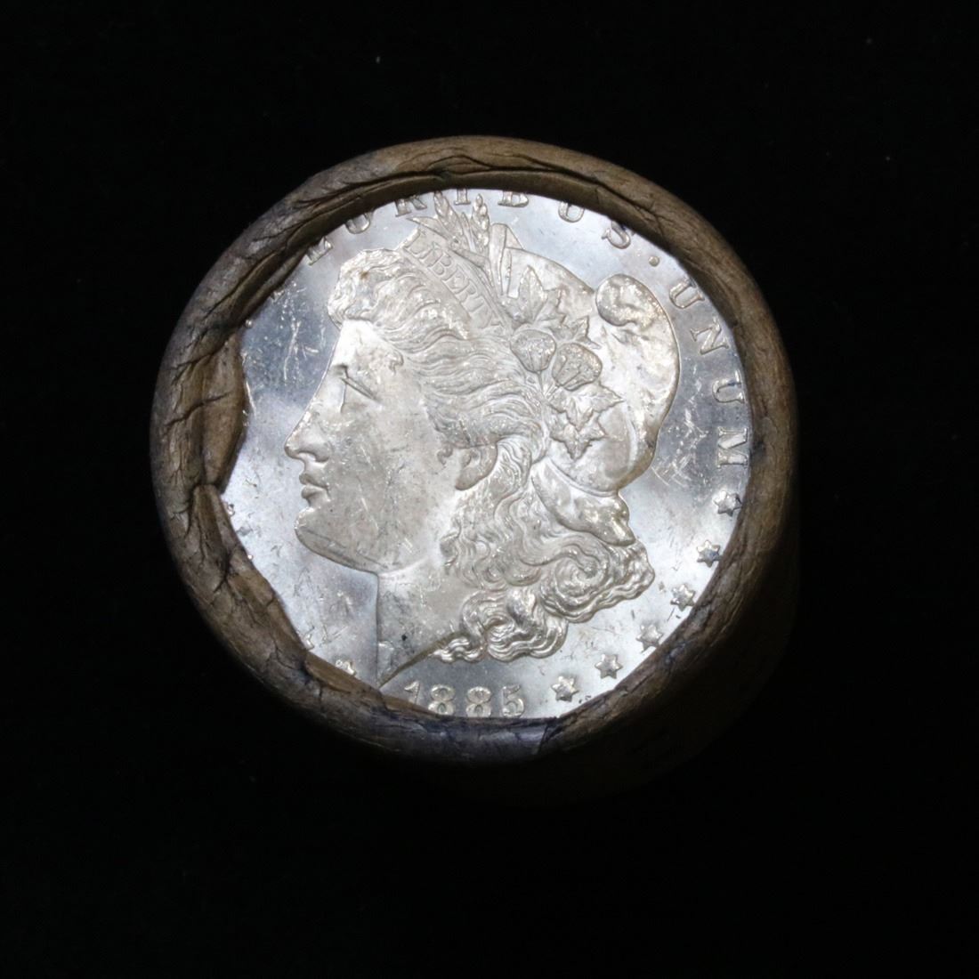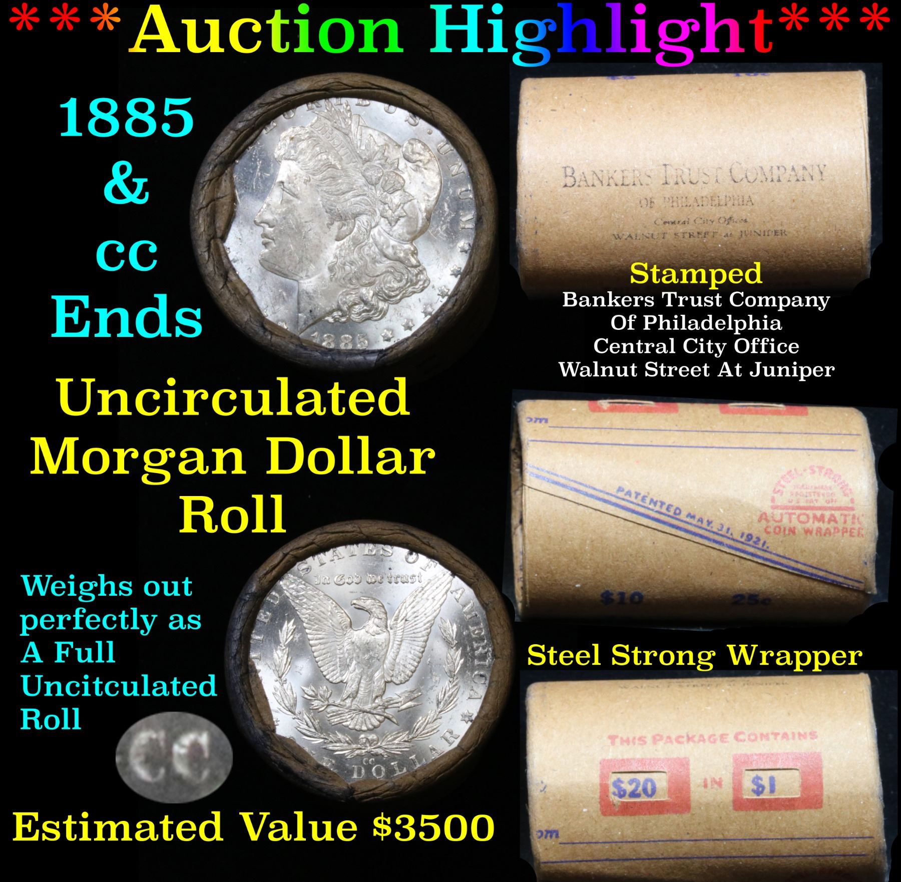***Auction Highlight*** 1885 & CC Uncirculated Morgan Dollar Shotgun Roll . .. Uncirculated Morgan Dollar Roll, Superb Ends, Old Steel Strong Wrapper, Faintly Stamped Bankers Trust Company Of Philadelphia, Walnut St at Juniper. Weighs Perfectly as a Uncirculated Roll. The 1885 has frosty luster and CC end has blazing flashy luster.