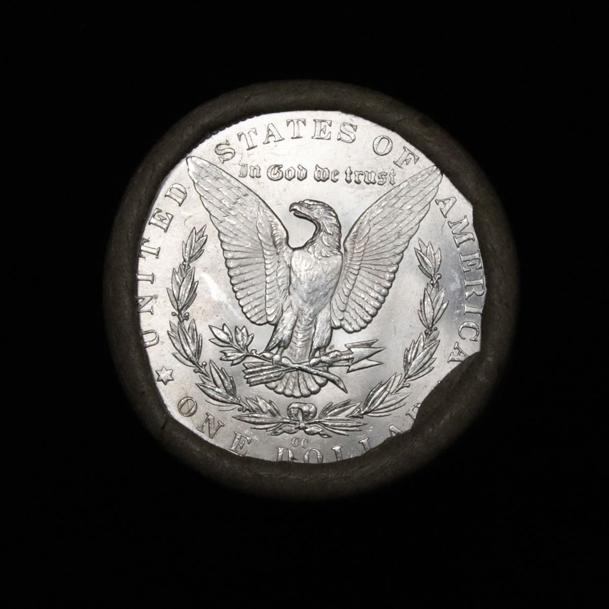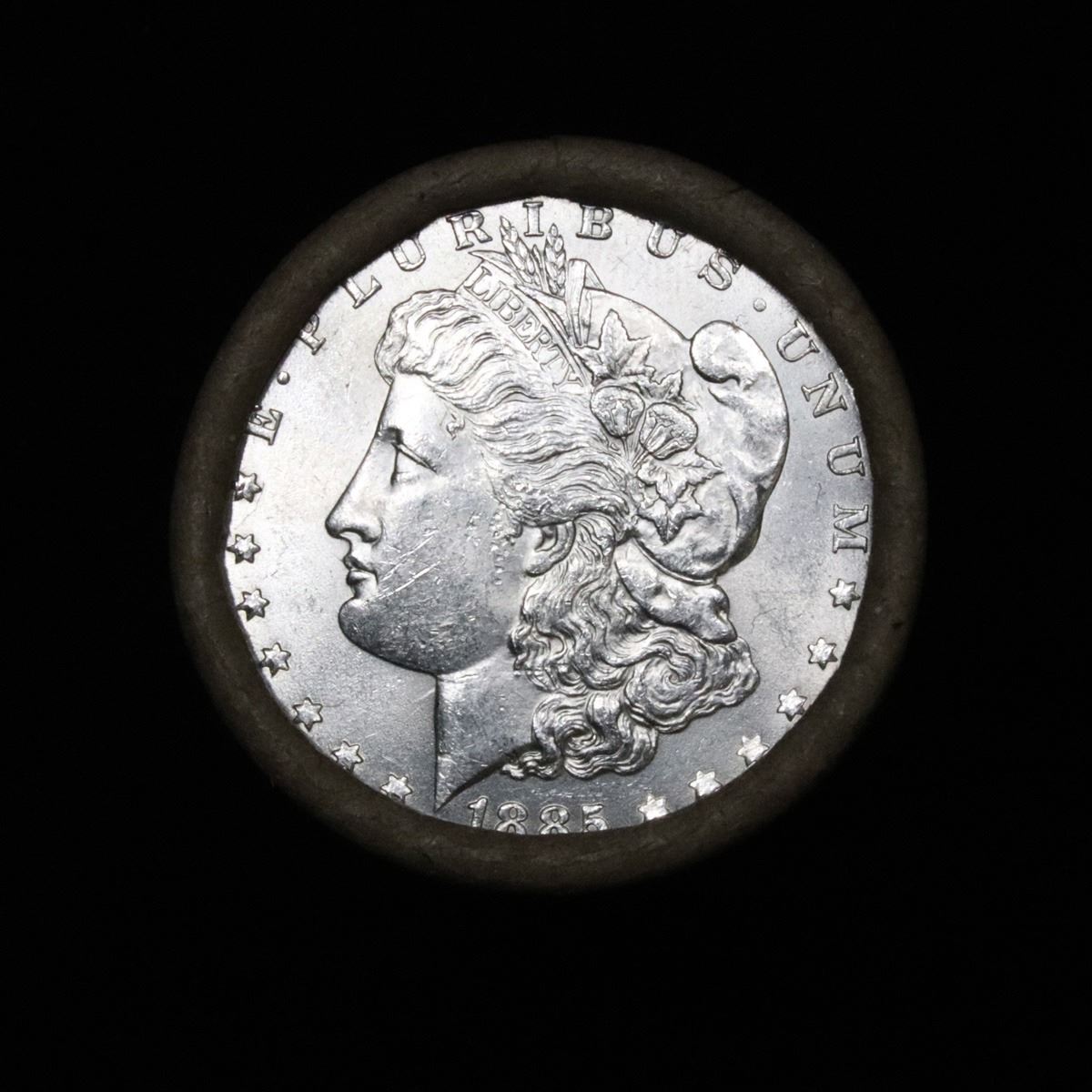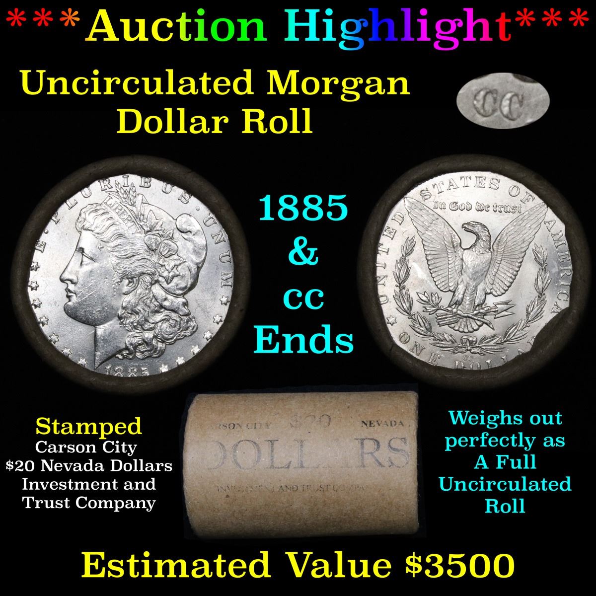 ***Auction Highlight*** 1885 & CC Uncirculated Morgan Dollar Shotgun Roll . .. Uncirculated Morgan Dollar Roll, Superb Ends, Carson City, Nevada Investment and Trust Co wrapper. Weighs Perfectly as a Uncirculated Roll. The ends have great luster.