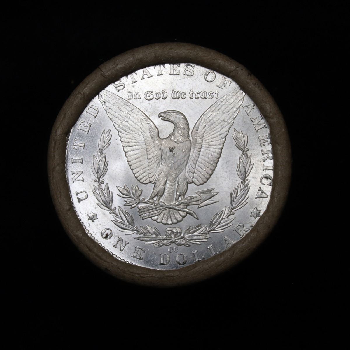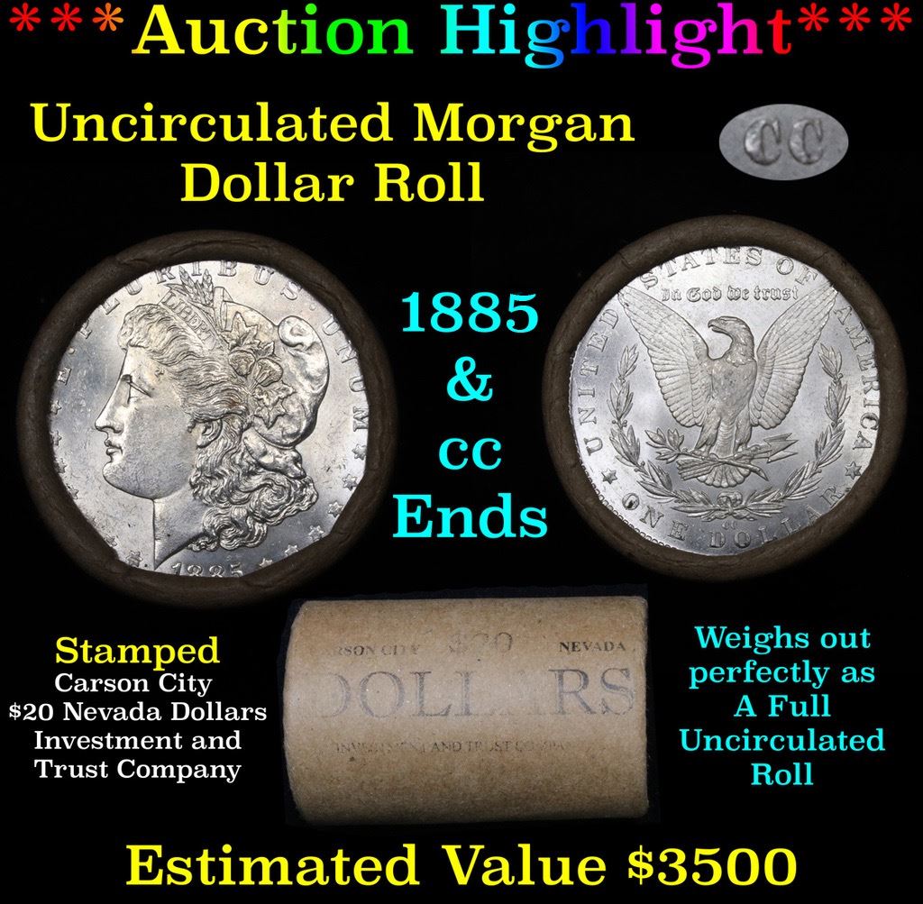 ***Auction Highlight*** 1885 & CC Uncirculated Morgan Dollar Shotgun Roll. Uncirculated Morgan Dollar Roll, Superb Ends, Carson City, Nevada Investment and Trust Co wrapper. Weighs Perfectly as a Uncirculated Roll. Some golden toning on the obverse, super luster on the reverse end.