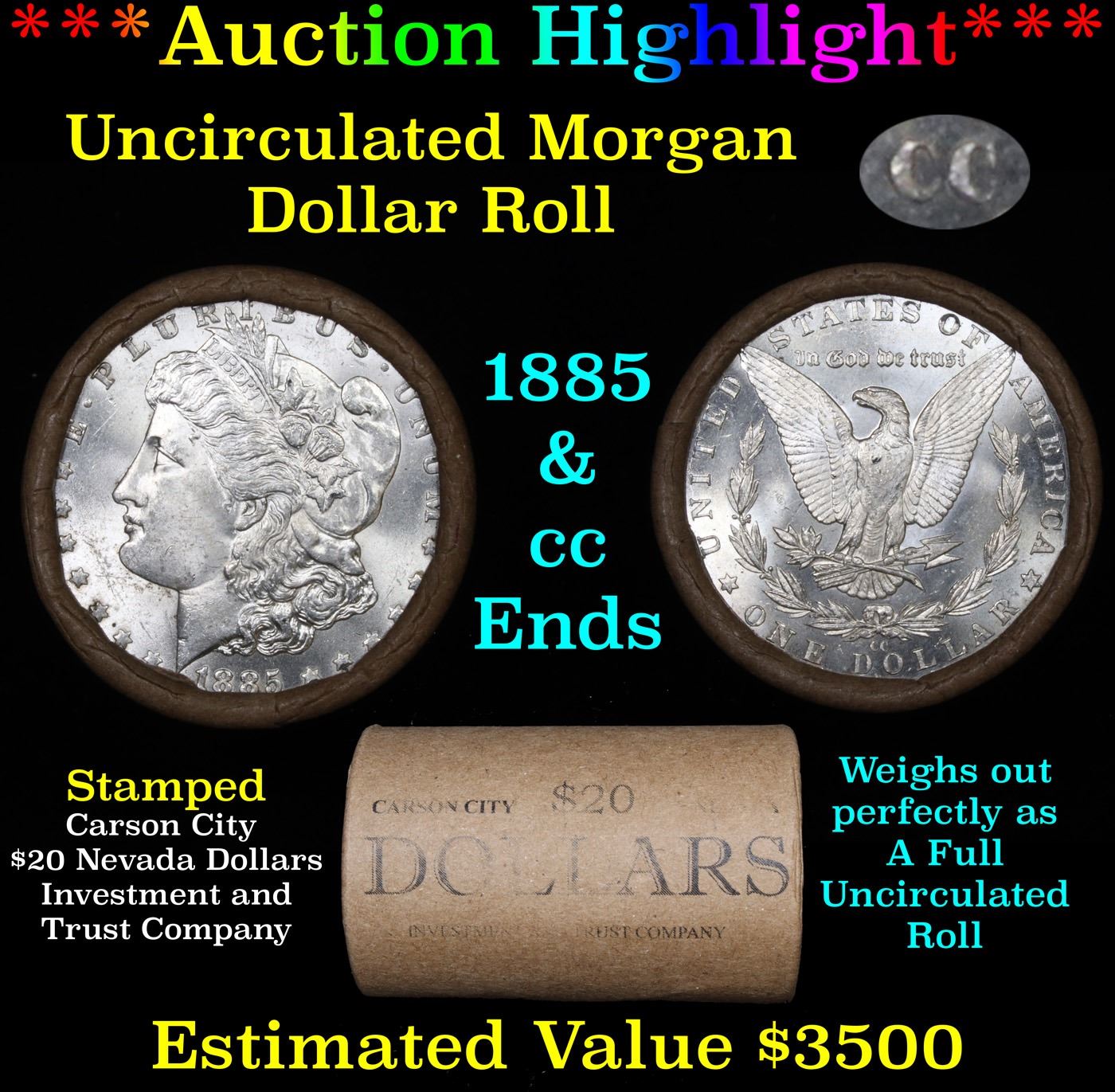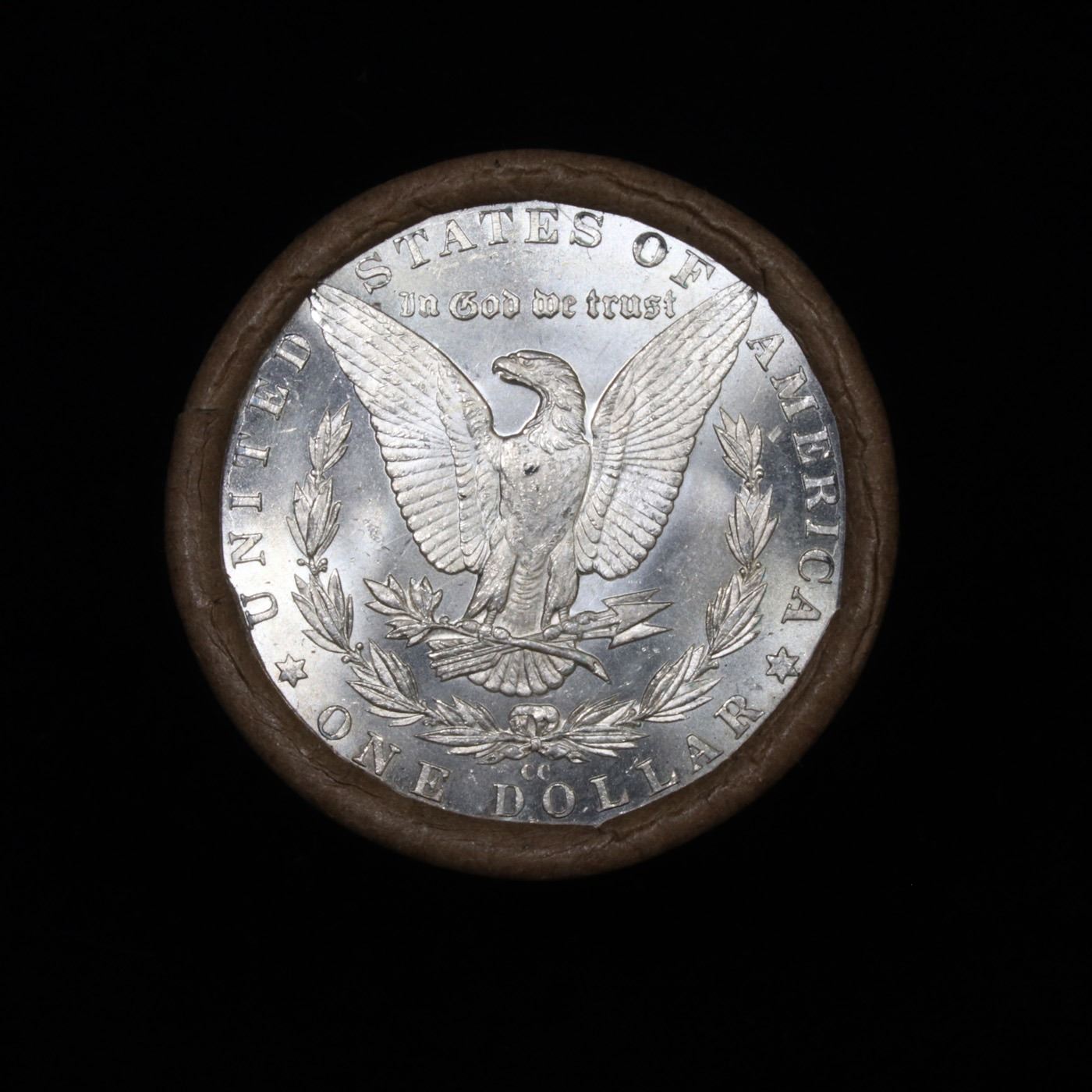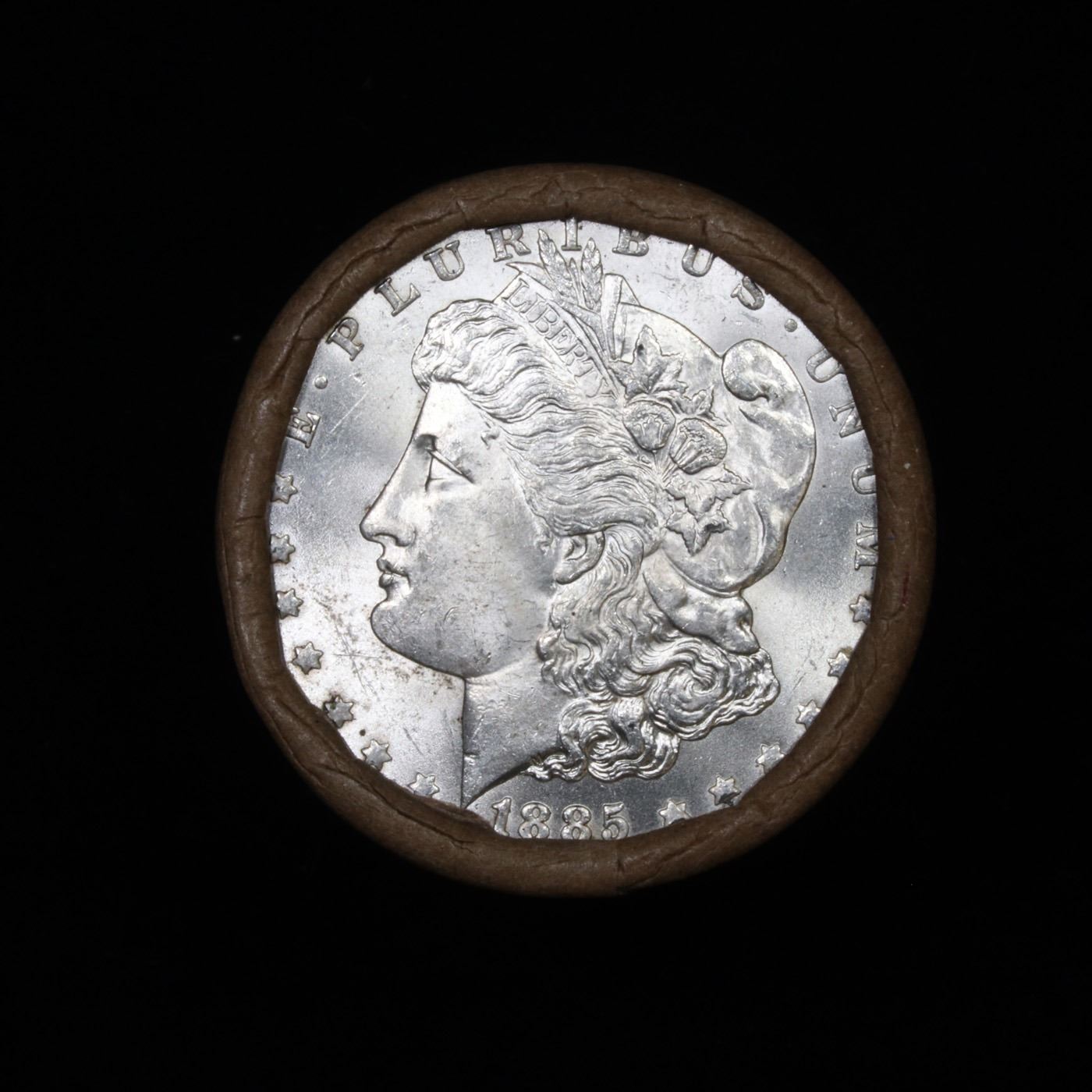 ***Auction Highlight*** 1885 & CC Uncirculated Morgan Dollar Shotgun Roll. Uncirculated Morgan Dollar Roll, Superb Ends, Carson City, Nevada Investment and Trust Co wrapper. Weighs Perfectly as a Uncirculated Roll. Great luster and some light golden toning on the ends, the 'cc' end is PL ( proof like)