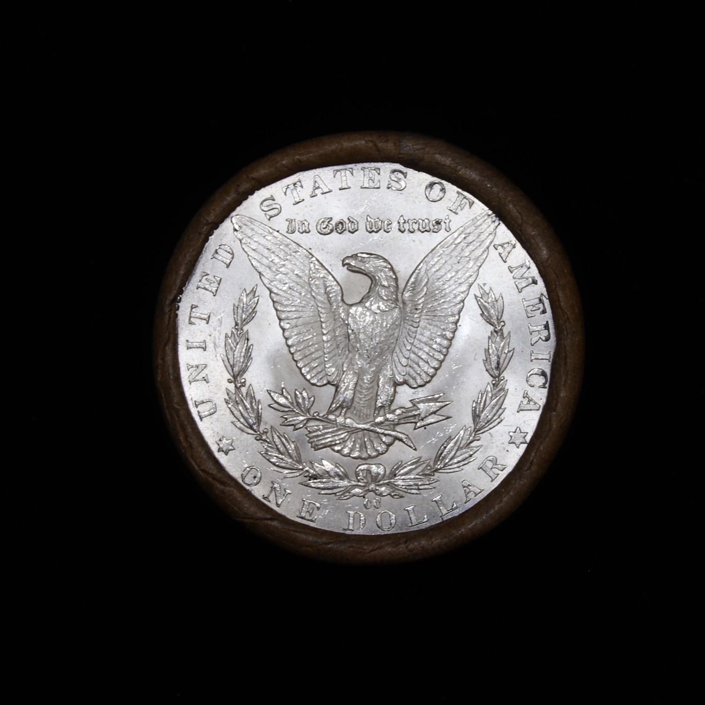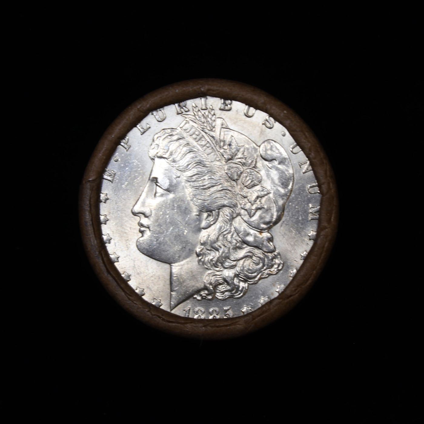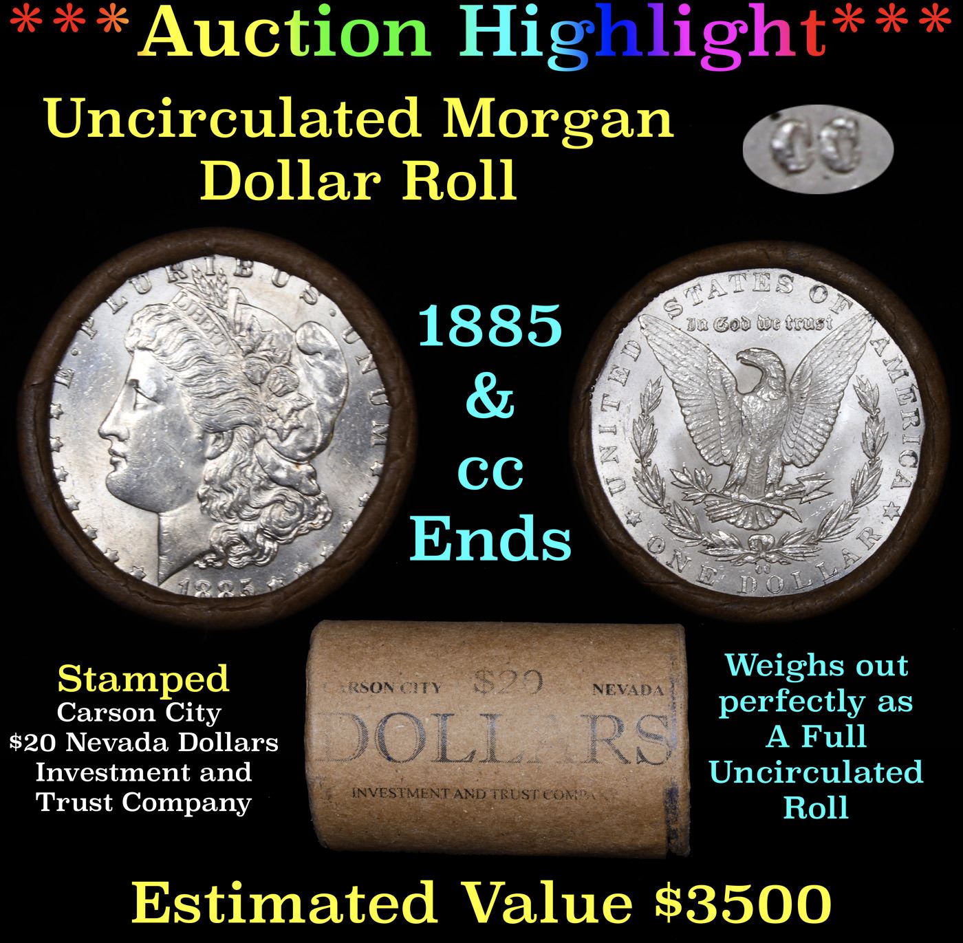 ***Auction Highlight*** 1885 & CC Uncirculated Morgan Dollar Shotgun Roll.        Uncirculated Morgan Dollar Roll, Superb Ends, Carson City, Nevada Investment and Trust Co wrapper. Weighs Perfectly as a Uncirculated Roll. Great luster and some light golden toning on the ends