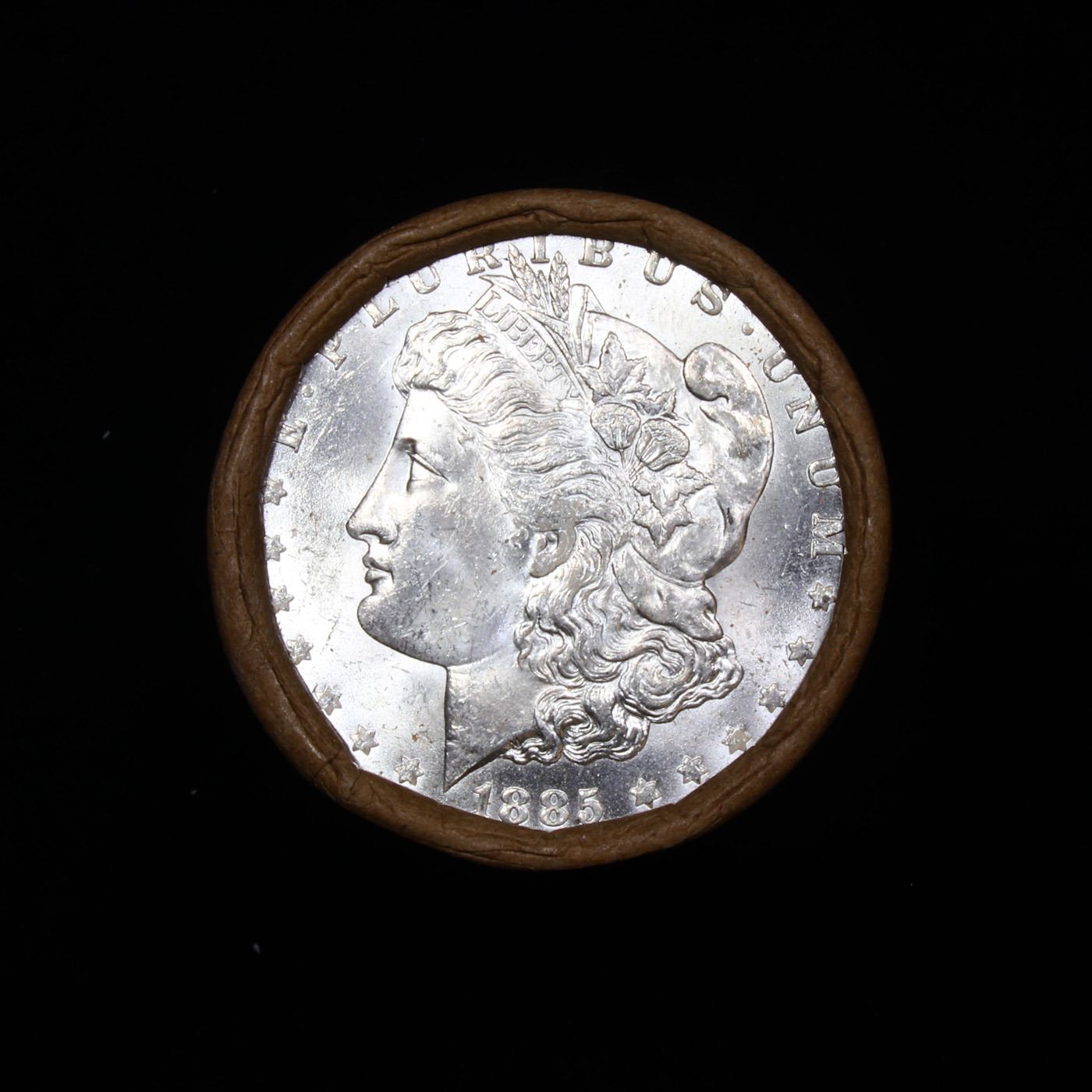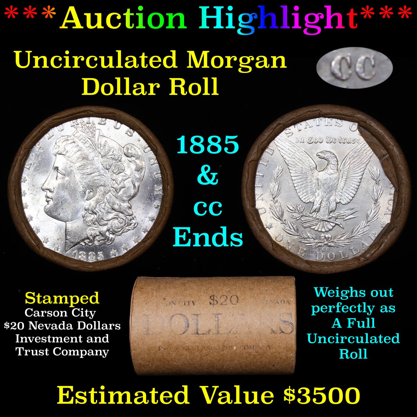 ***Auction Highlight*** 1885 & CC Uncirculated Morgan Dollar Shotgun Roll. Uncirculated Morgan Dollar Roll, Superb Ends, Carson City, Nevada Investment and Trust Co wrapper. Weighs Perfectly as a Uncirculated Roll.