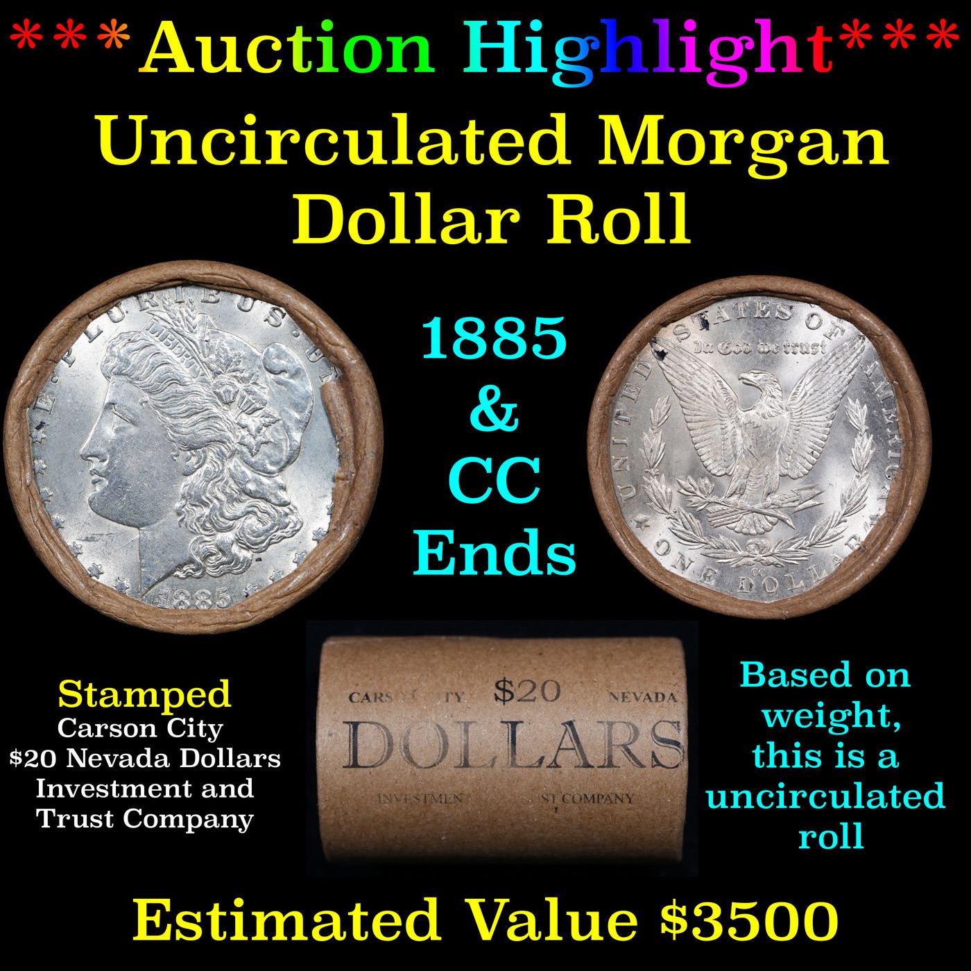 ***Auction Highlight*** 1885 & CC Uncirculated Morgan Dollar Shotgun Roll. Uncirculated Morgan Dollar Roll, Superb Ends, Carson City, Nevada Investment and Trust Co wrapper. Weighs Perfectly as a Uncirculated Roll.