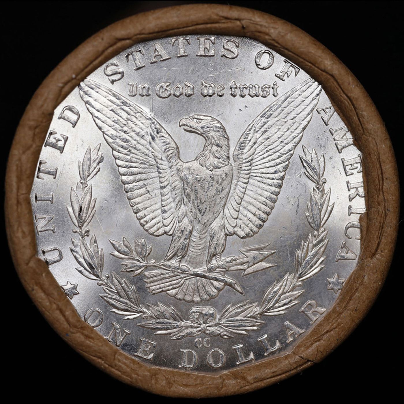 ***Auction Highlight*** 1885 & CC Uncirculated Morgan Dollar Shotgun Roll. Uncirculated Morgan Dollar Roll, Superb Ends In an old Ulster & Deleware Railroad to the Catskill Mountains wrapper. Weighs Perfectly as a Uncirculated Roll.