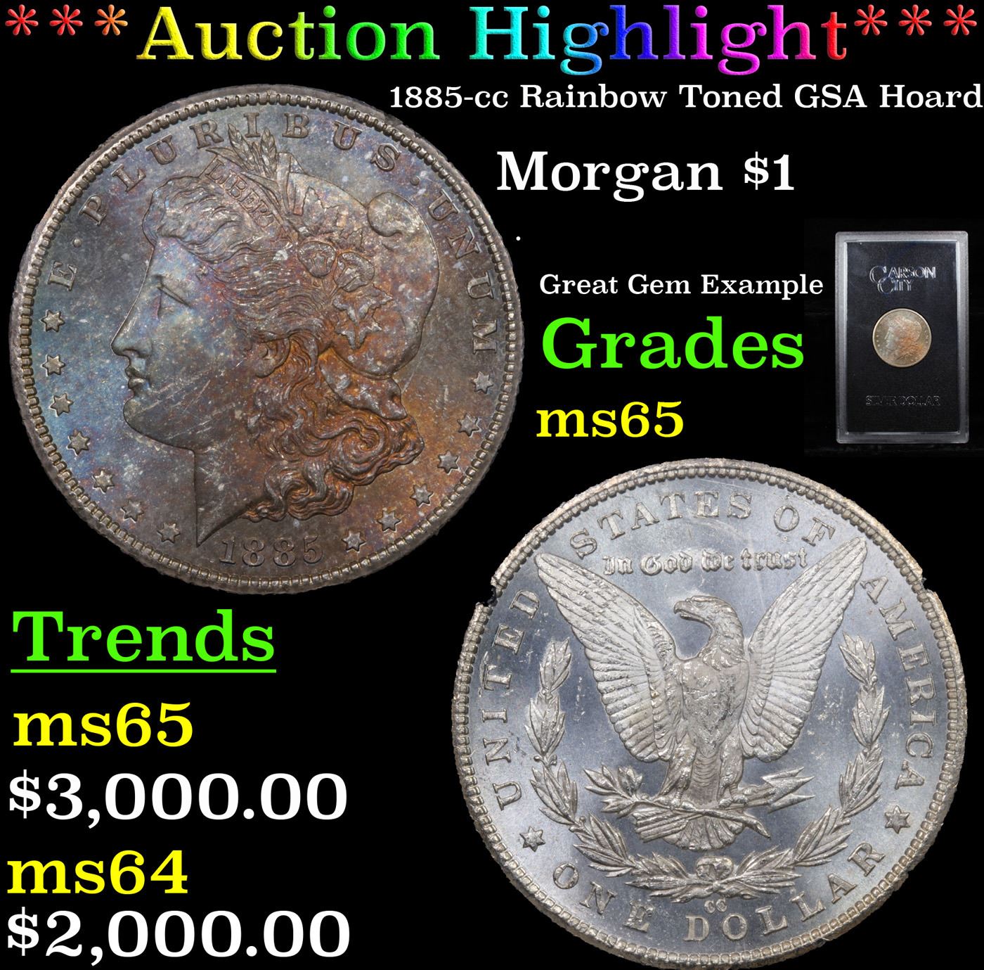 ***Auction Highlight*** 1885-cc Rainbow Toned GSA Hoard Morgan Dollar $1 Grades GEM Unc. A Corey's Pick, Bid to Win, Don't let it get Away, you might not find its equal Coin. I give this coin my highest recommendation