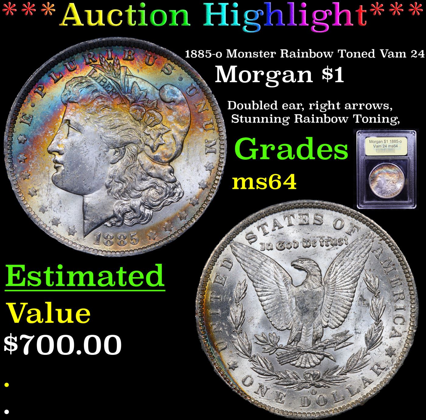 ***Auction Highlight*** 1885-o Monster Rainbow Toned Vam 24 Morgan Dollar $1 Graded Choice Unc By US