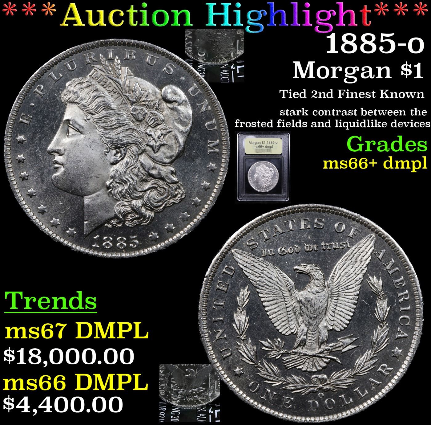 ***Auction Highlight*** 1885-o Morgan Dollar $1 Graded GEM++ DMPL BY USCG. This plentiful New Orleans issue becomes much more challenging to locate at this spectacular grade level with Deep Mirror Proof like surfaces. Total brilliance enhances stark contrast between the frosted fields and liquidlike devices. Both sides are razor-sharp and the coin displays cameo contrast reminiscent of a proof, with a full strike and beautifully preserved, untoned surfaces. Tied for 2nd Finest Known! A Corey's Pick, Bid to Win, Don't let it get Away, you might not find its equal Coin. I give this coin my highest recommendation