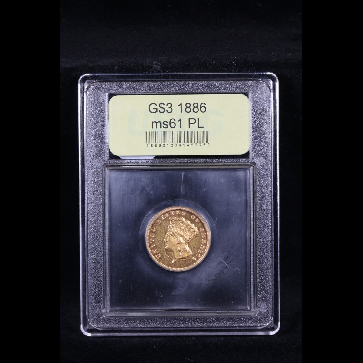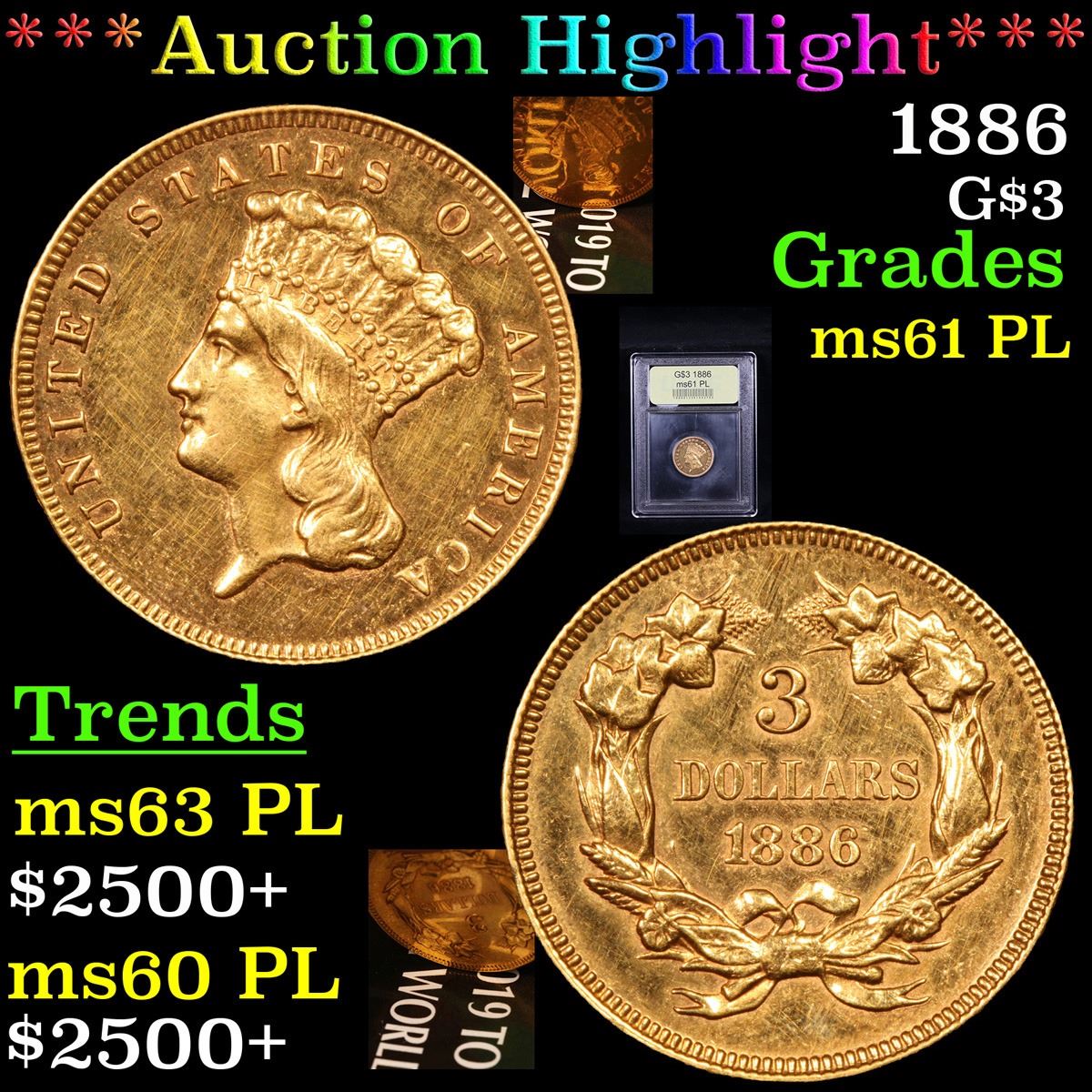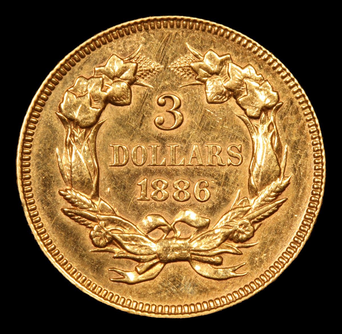 ***Auction Highlight*** 1886 . . Three Dollar Gold .$3 Graded Unc+ PL By USCG.